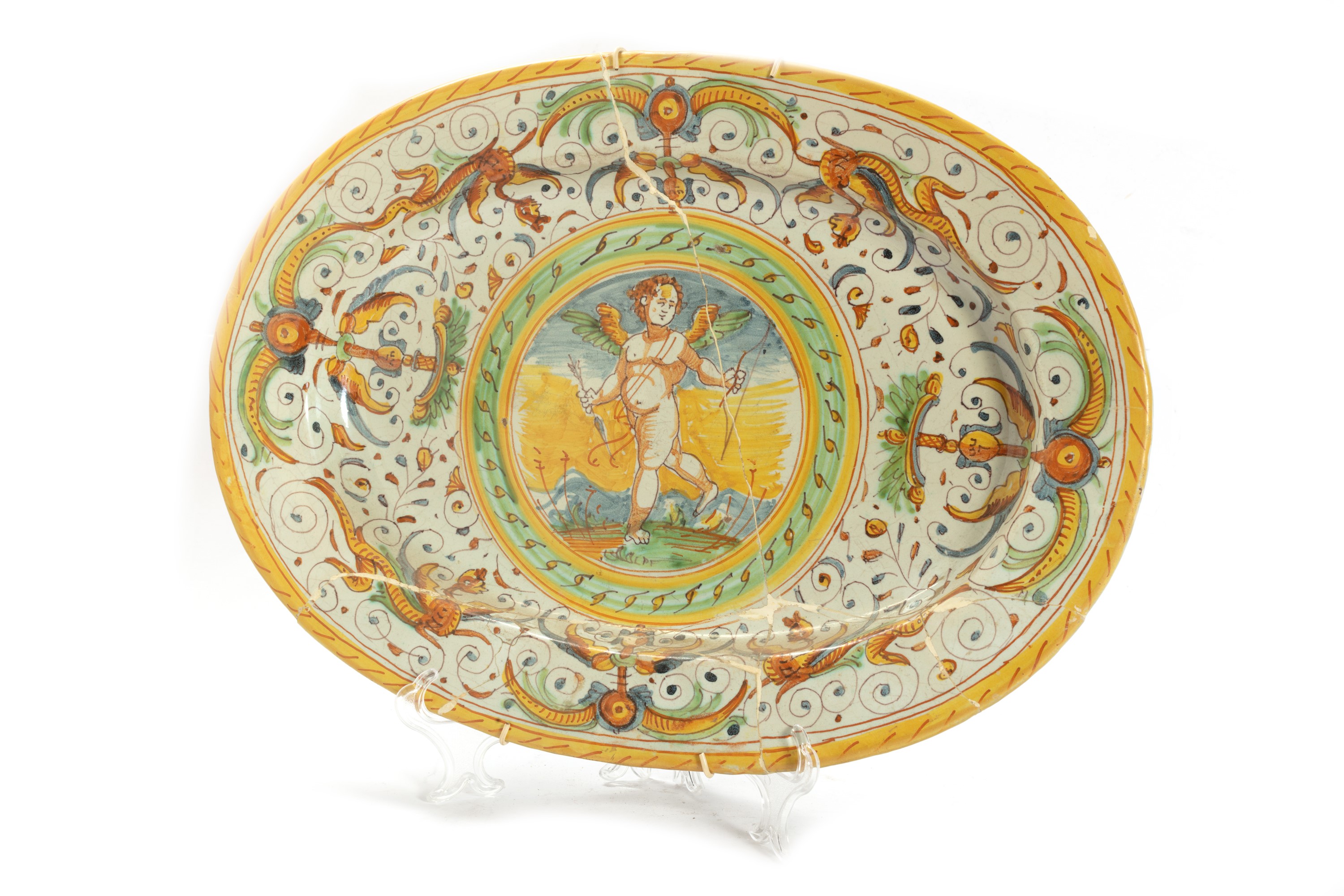 Piatto ovale in maiolica policroma decorato a grottesche e Cupido al centro