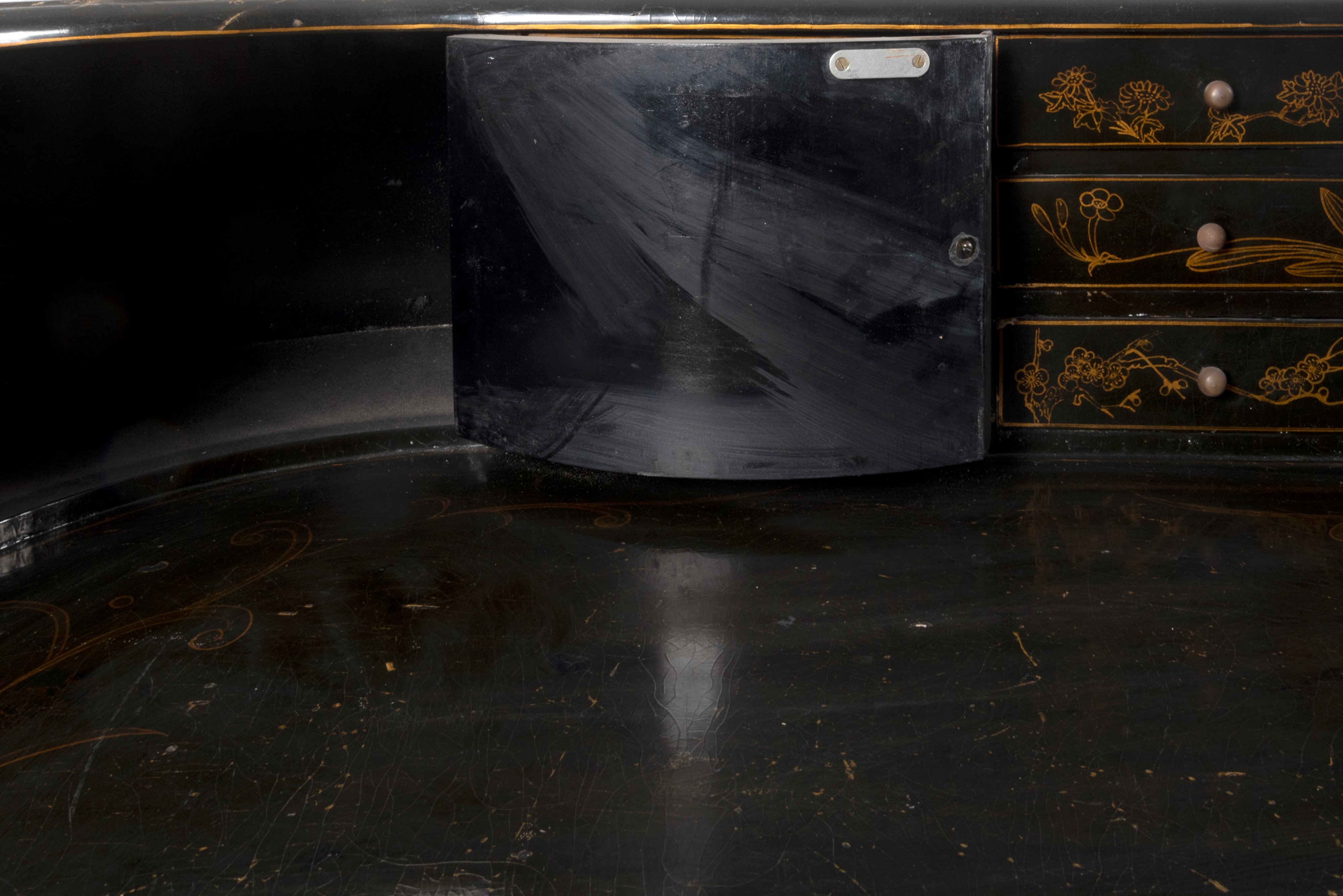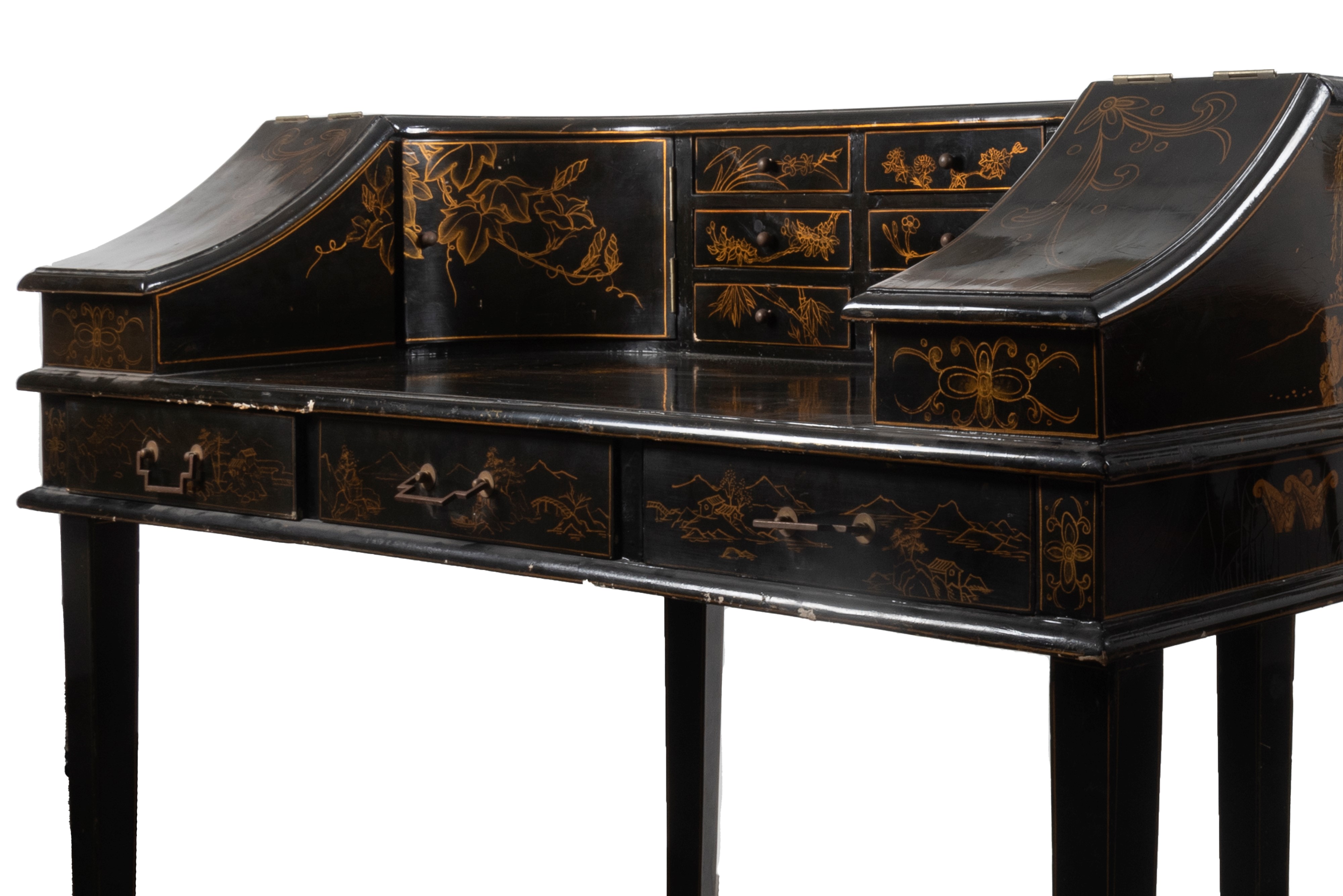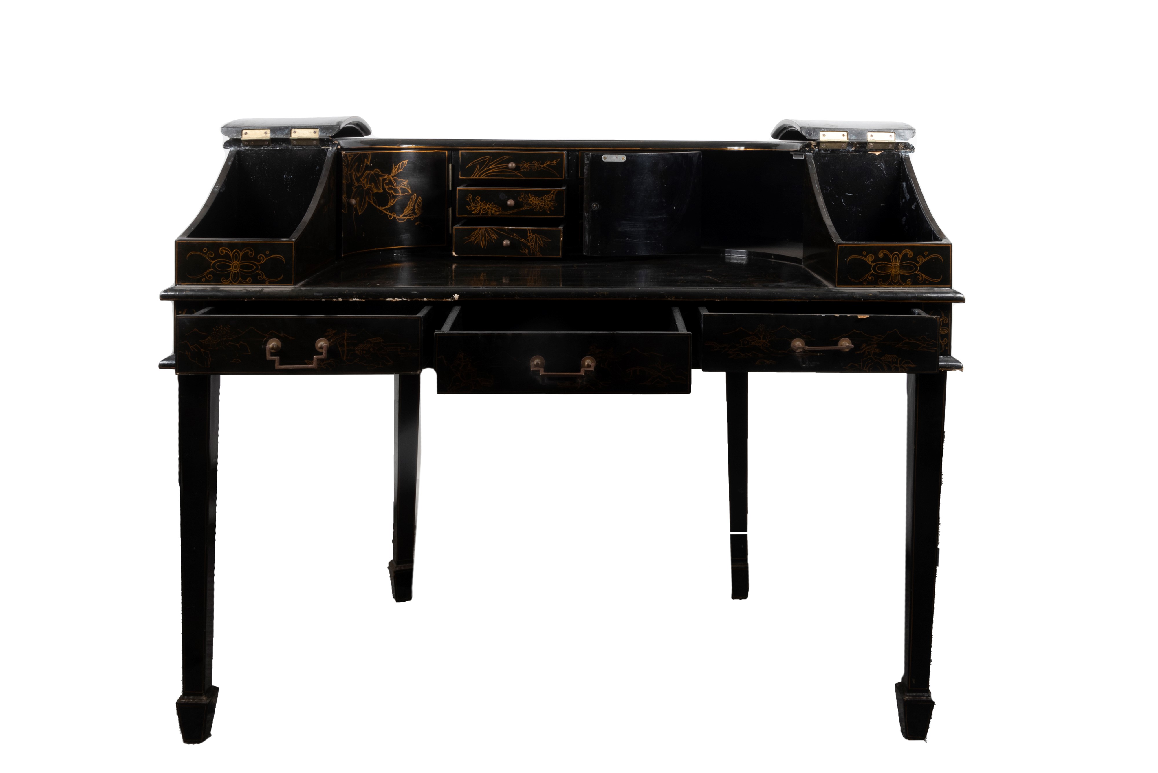 Scrivania da centro Carlton House in legno laccato nero decorata con motivi a Chinoserie, [..]