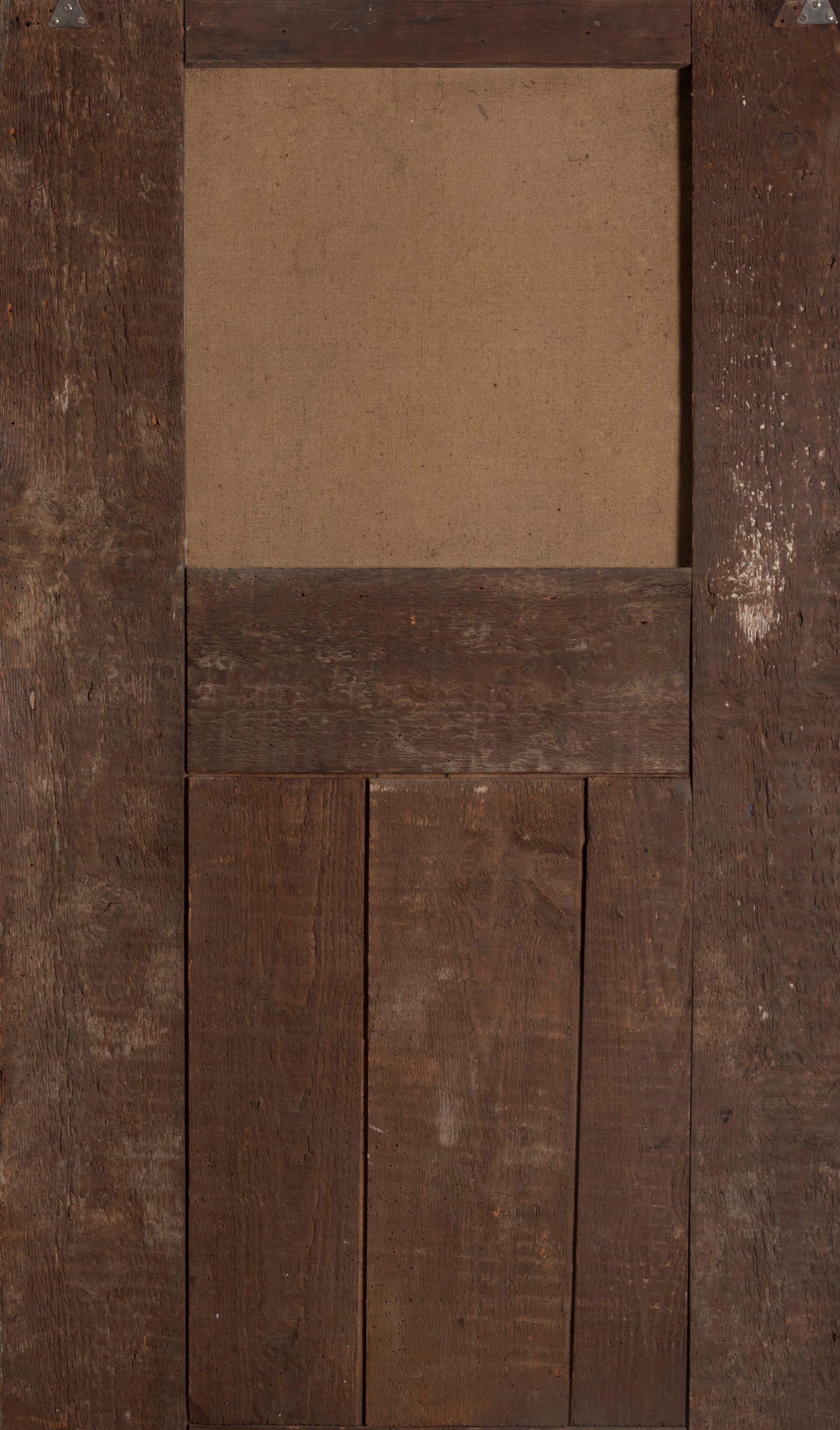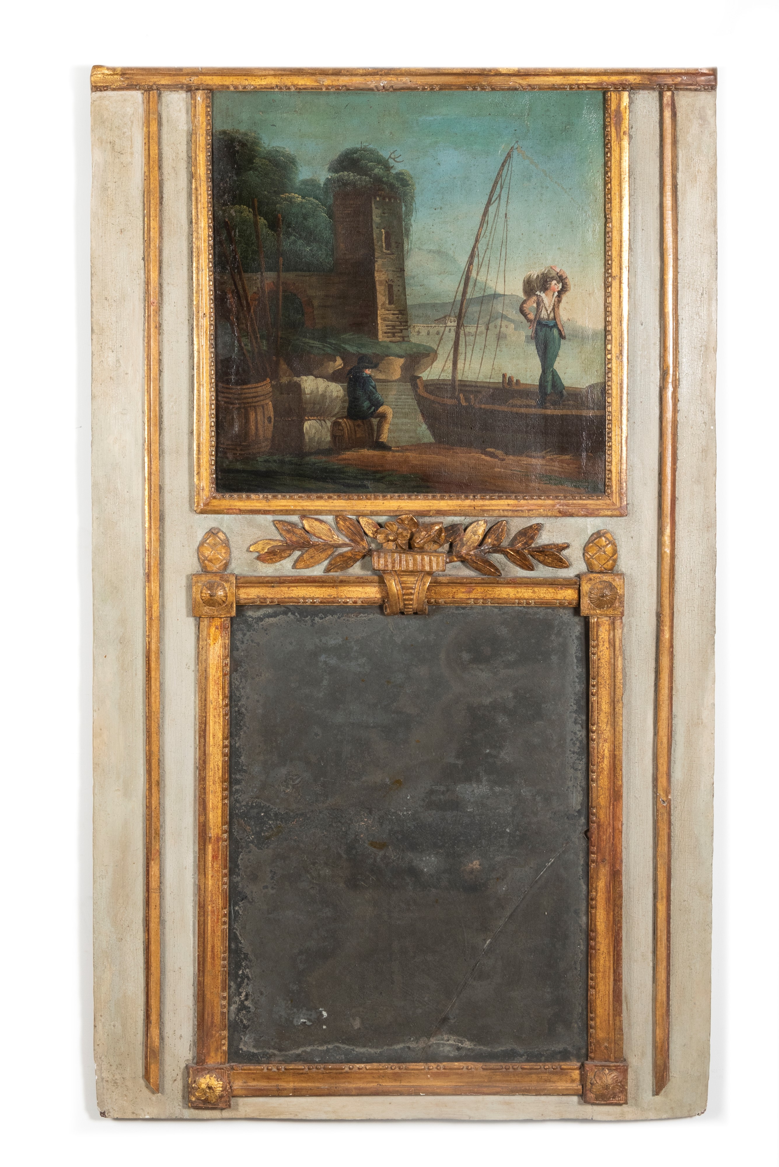 nella parte superiore dipinto a olio su tela e raffigurante marina con barche e pescatori; nella parte inferiore specchiera