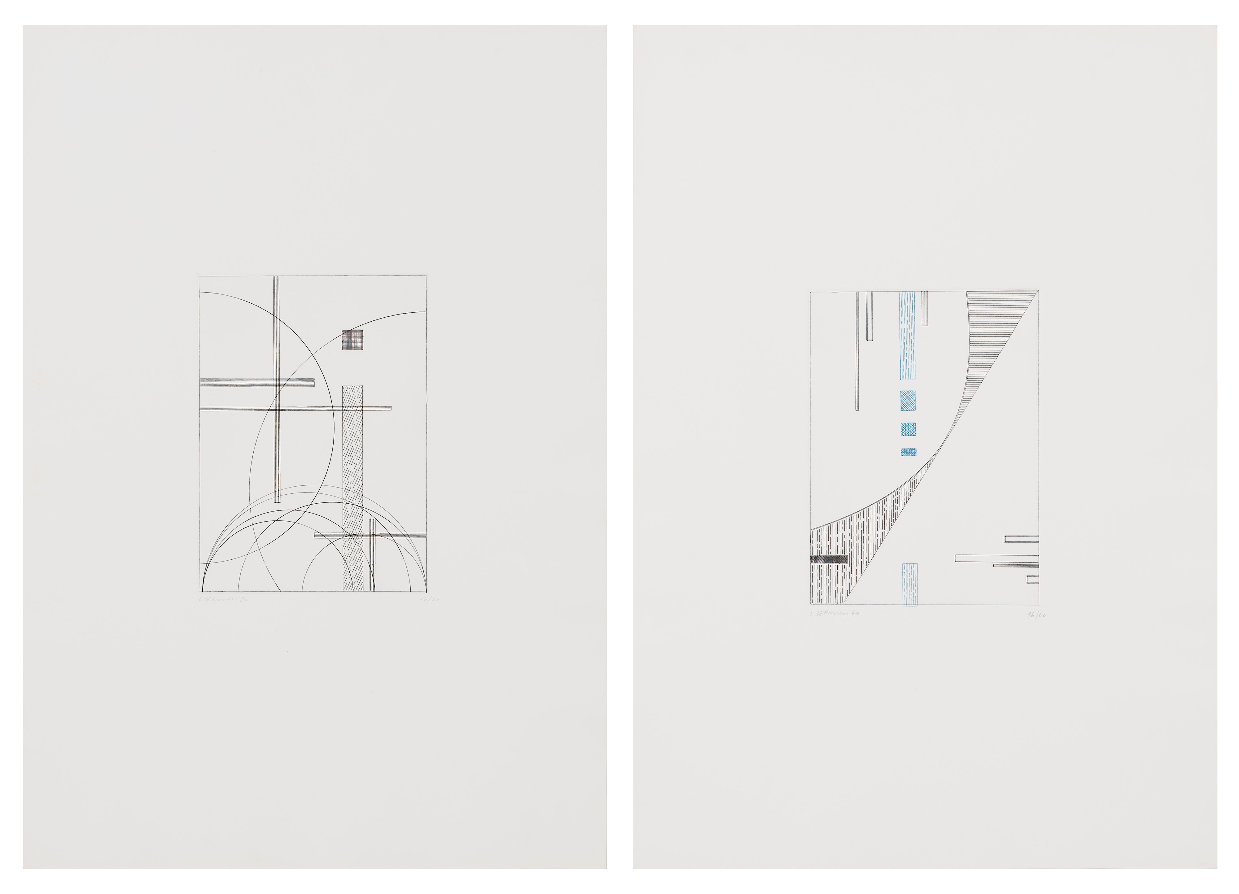 lotto di 2 incisioni es. 16/60, cm. 24x18 (lastra) 65x45 (foglio) cad.