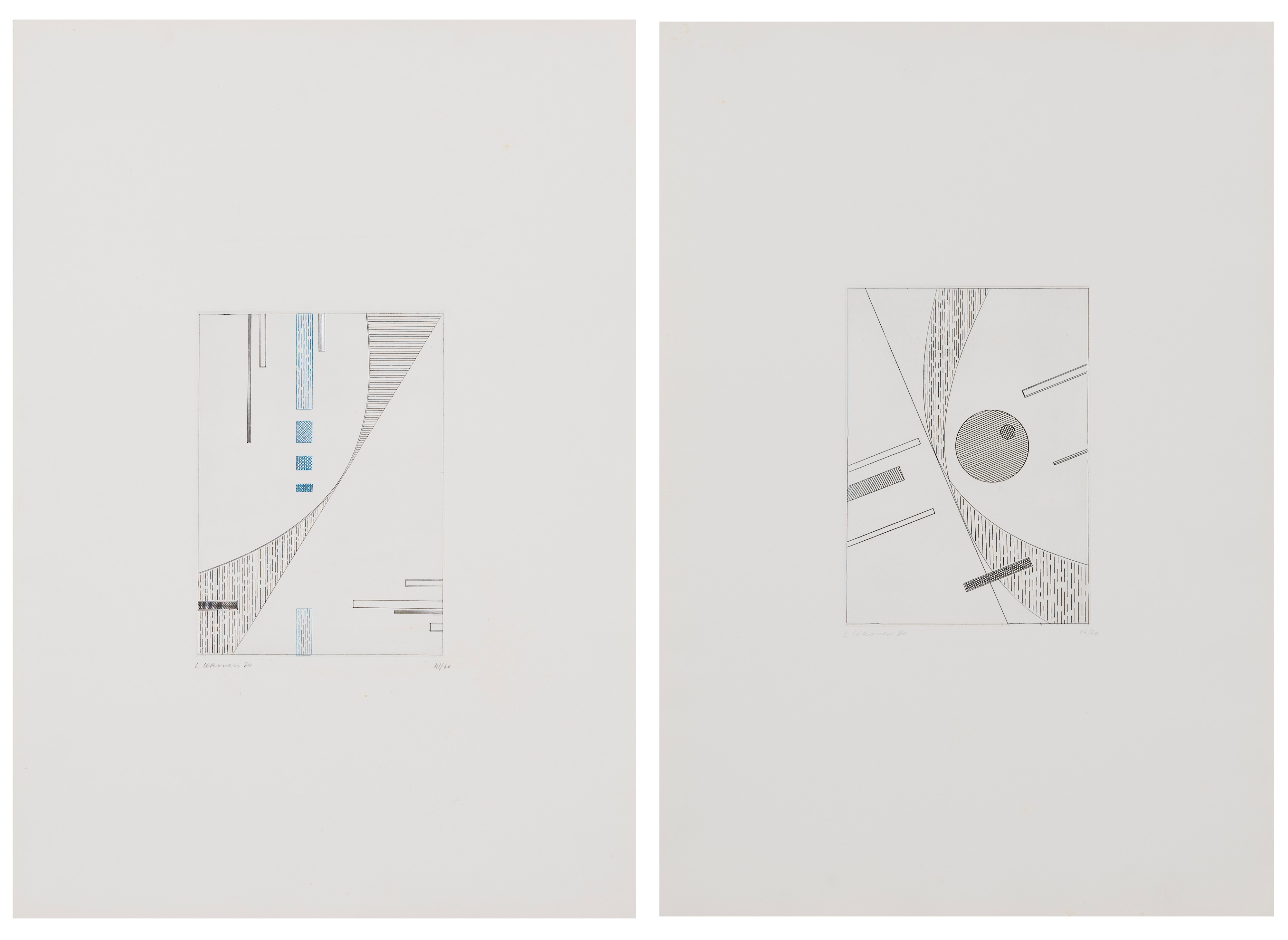lotto di 2 incisioni es. 16/60 e 41/60, cm. 24x18 (lastra) 65x45 (foglio) cad.