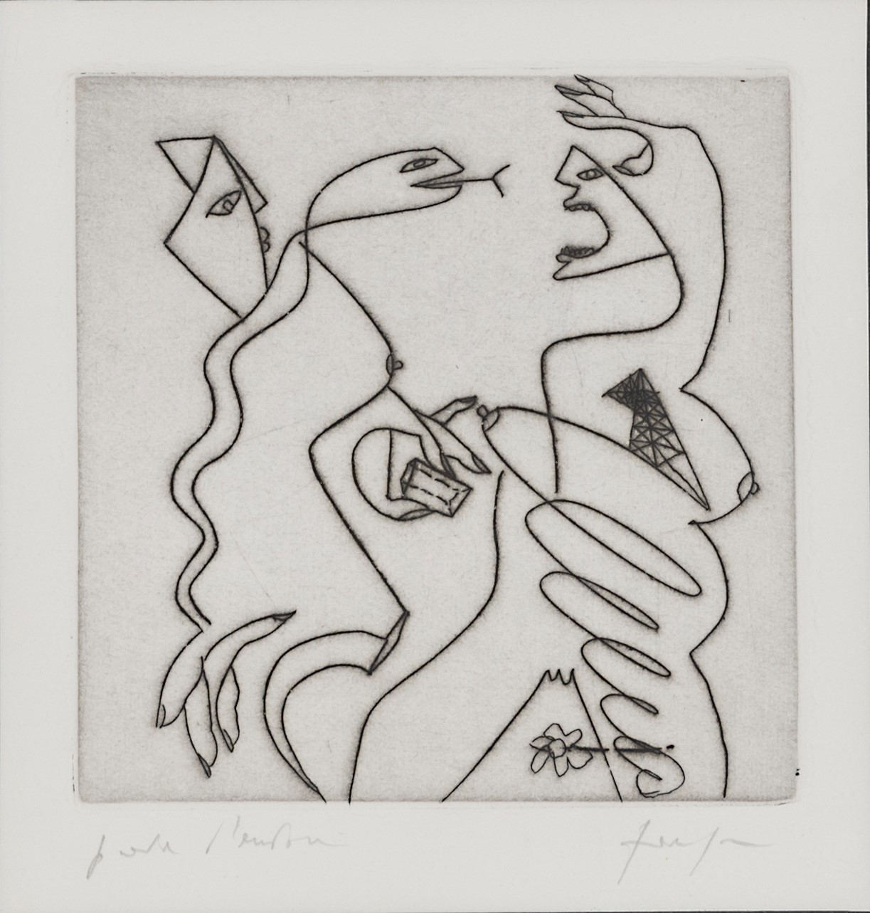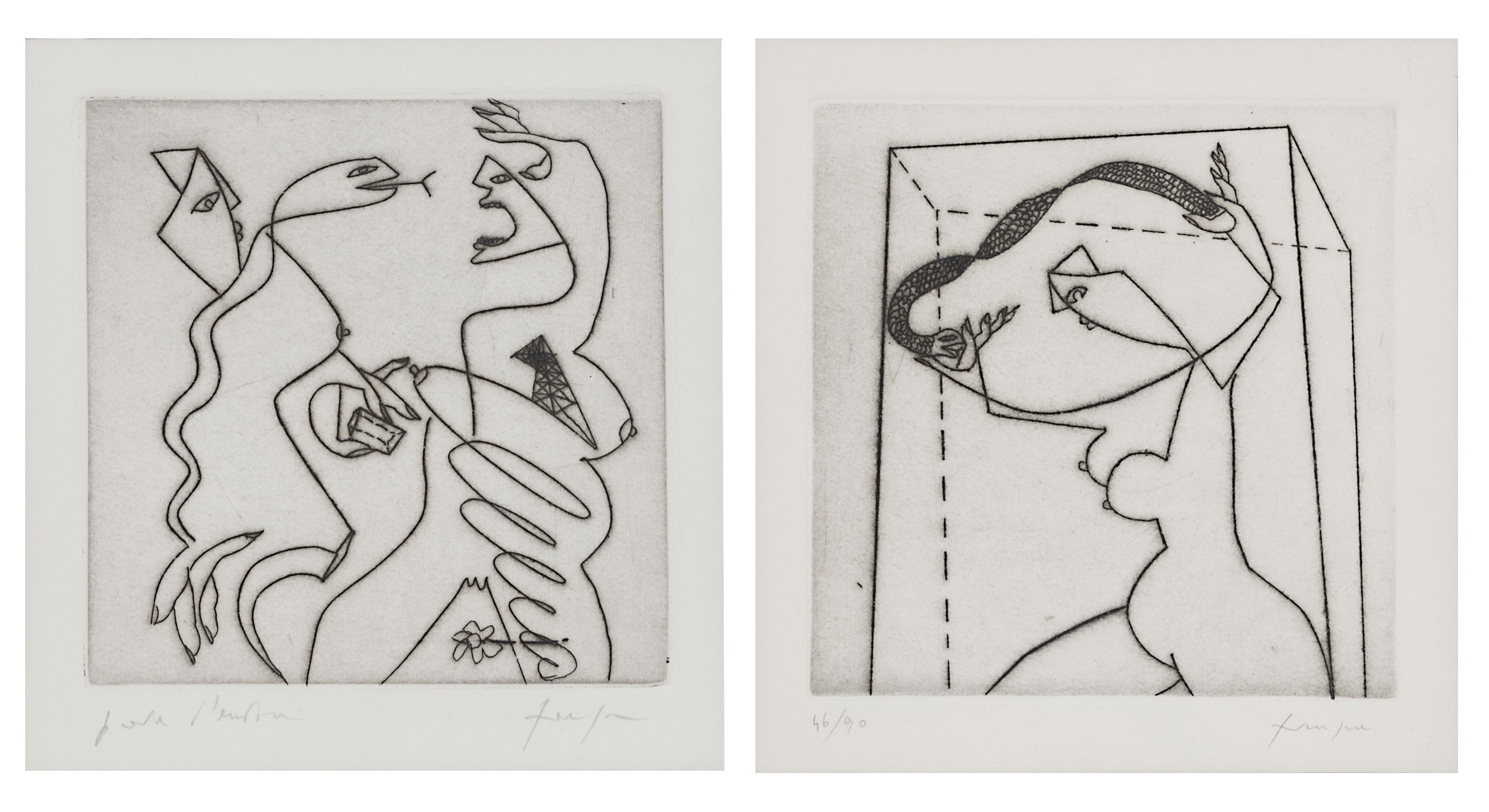 lotto di 2 acqueforti es. p.a. - 46/90, cm. 16x16 cad.