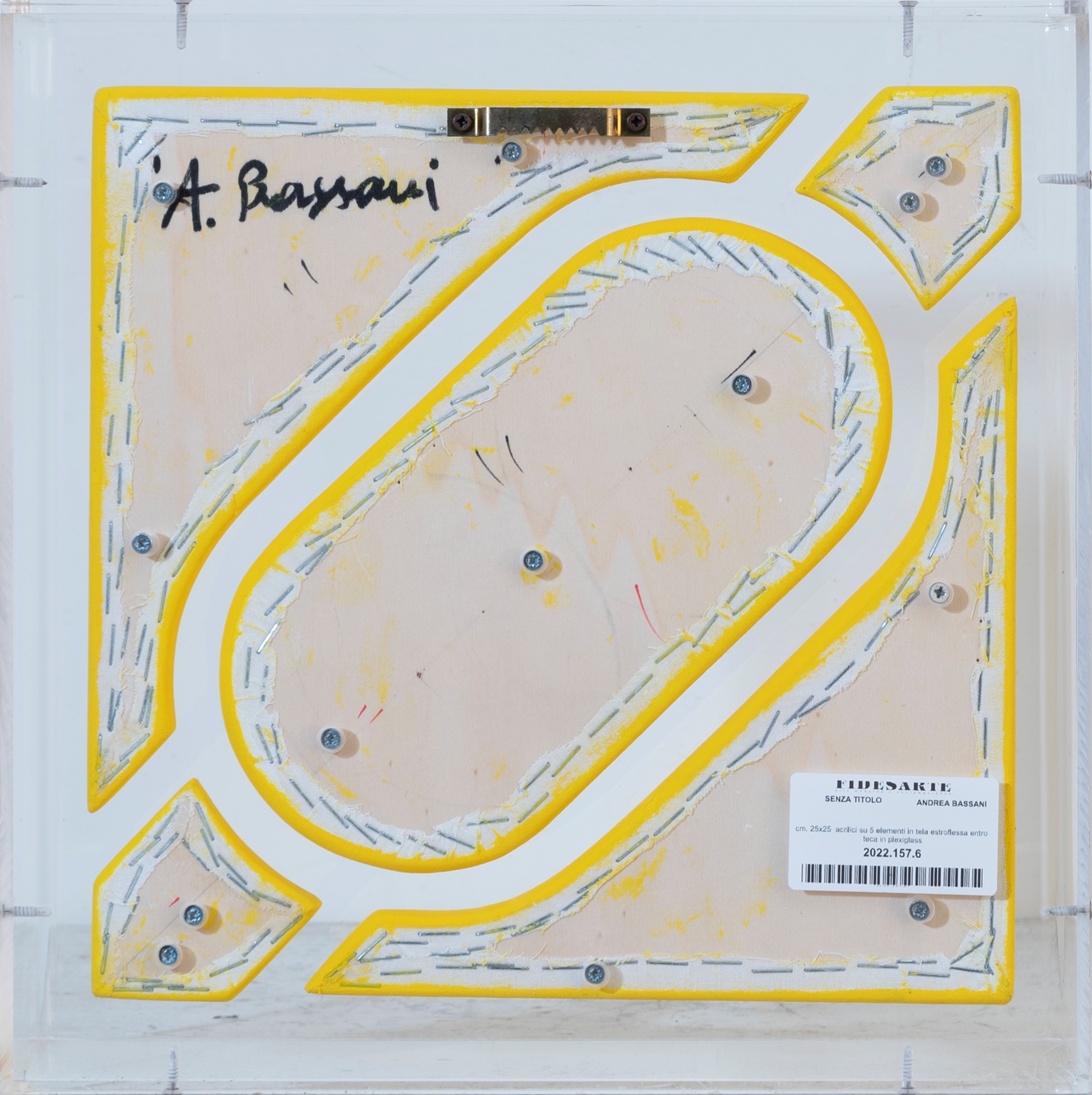 acrilici su 5 elementi in tela estroflessa entro teca in plexiglass, cm. 25x25