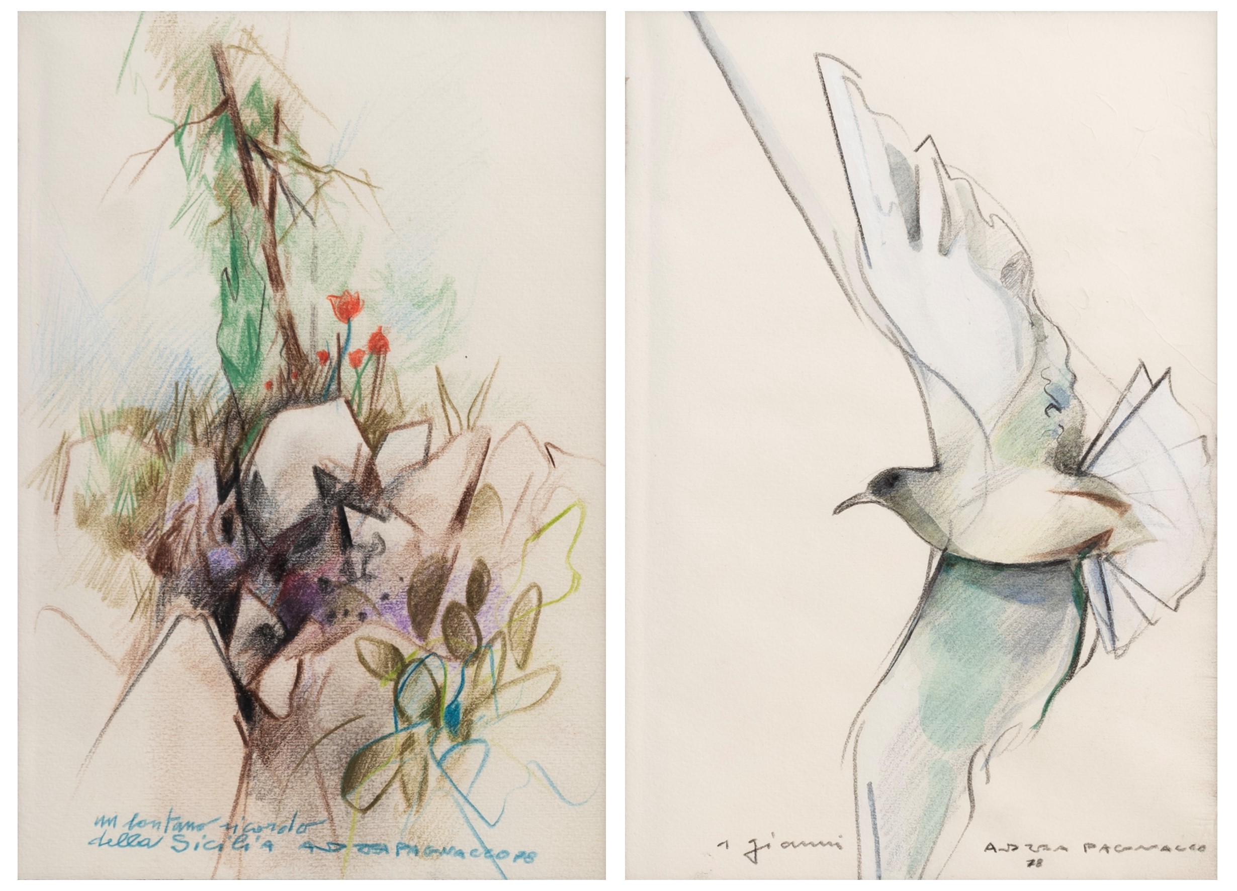 lotto di 2 tecniche miste su carta, cm. 17x25 cad.