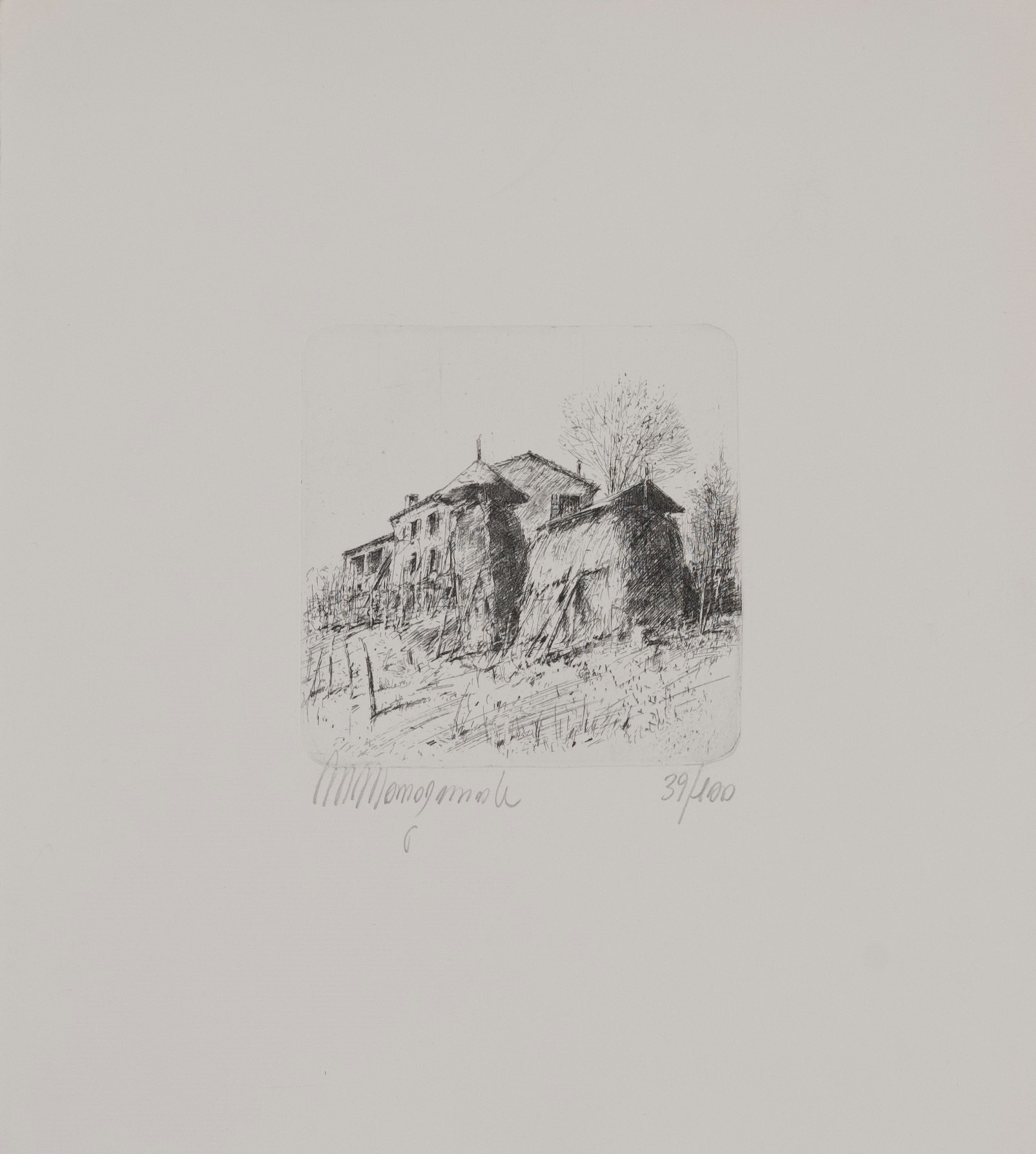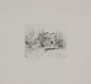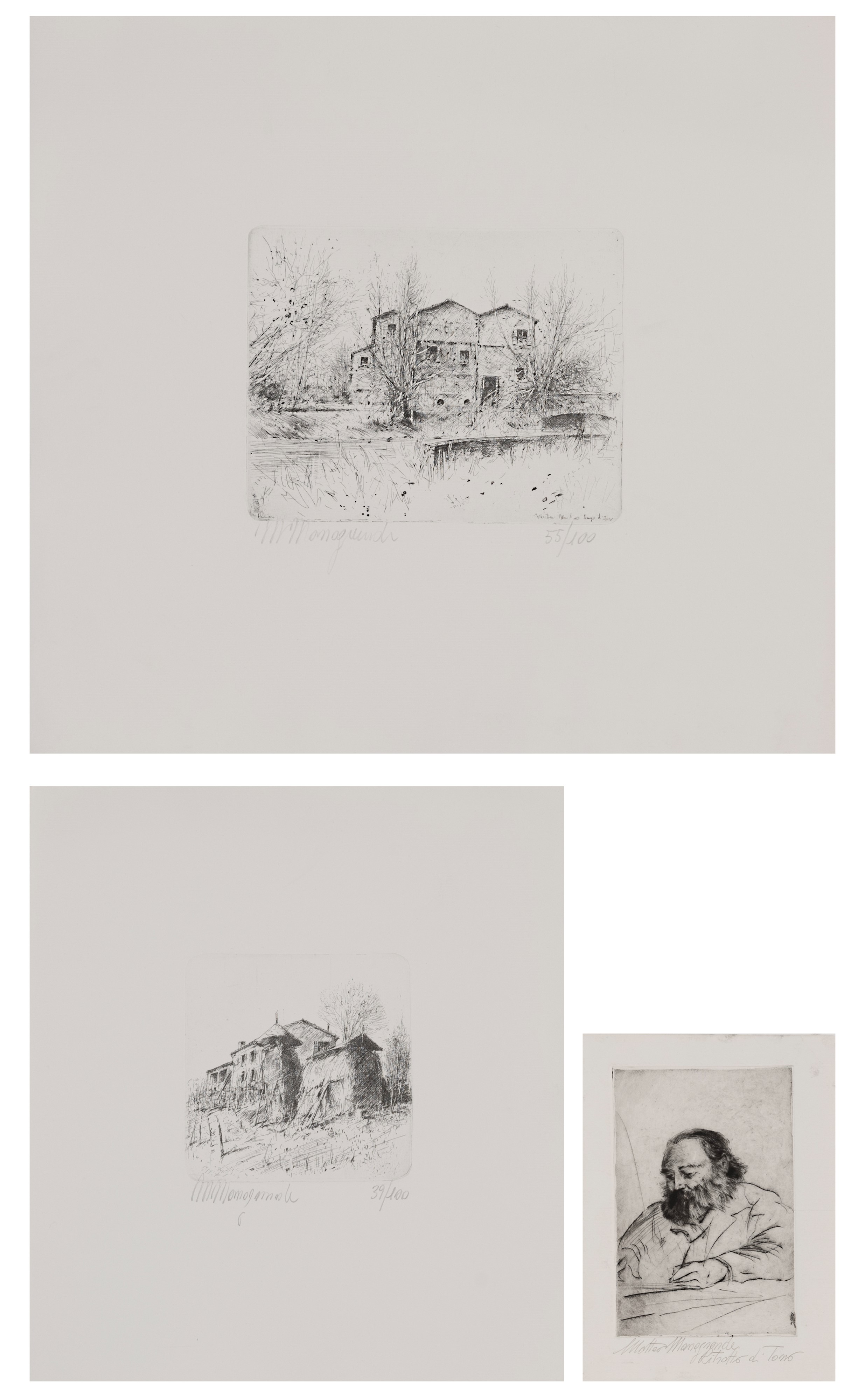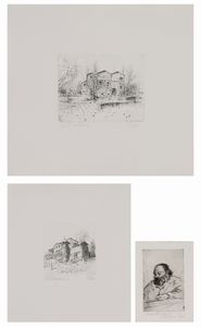 lotto di 3 acqueforti es. 55/100 - 39/100, cm. 49x53,5 - 39x35,5 - 23x17
