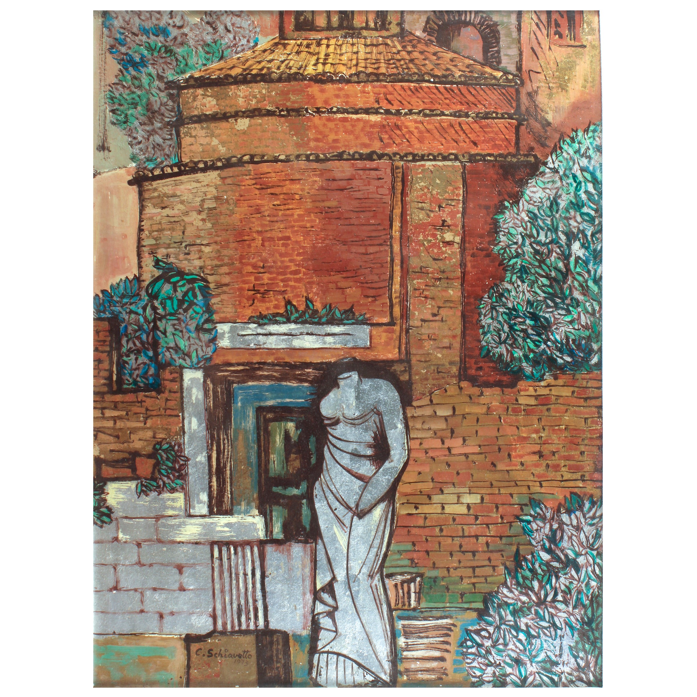 Roma 1913 - 2013 Scorcio di monumento con scultura classica, 1973, olio e foglia d'argento su truciolato