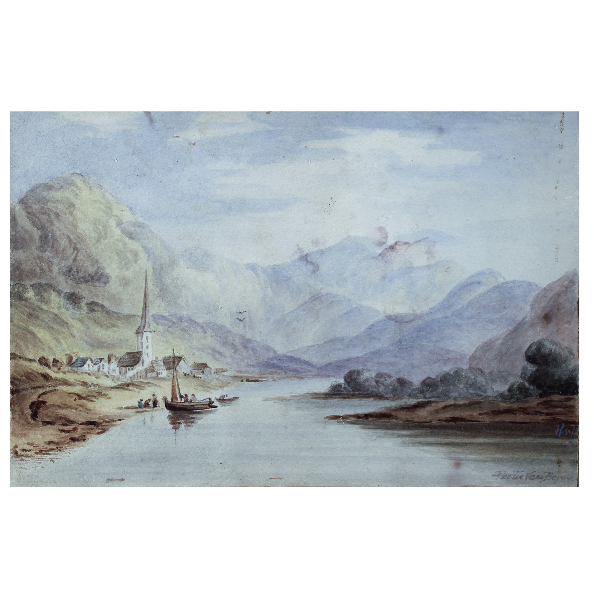 XX Sec. Paesaggio di montagna con lago, acquerello, firmato in basso a destra