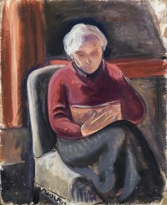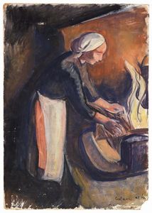 Olio su cartone, cm. 70,4x50 Titolo e firma in basso a destra: Contadina al fu[oco] / E. Chaplin. Storia Eredità [..]