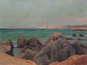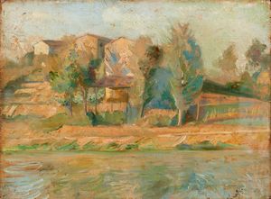 Olio su cartone, cm. 29,5x39,5 Firma in basso a sinistra: Valentino Ghiglia; titolo al verso: Livorno vista da [..]