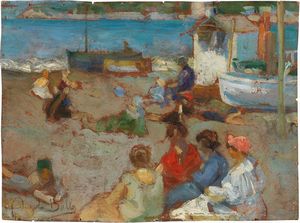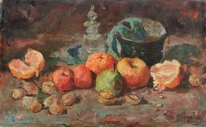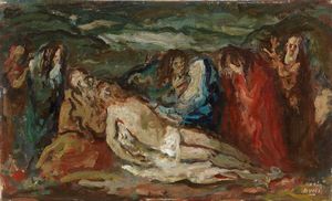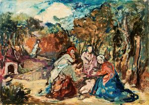 Olio su cartone, cm. 41,5x76 Al verso altra composizione: Busto di ragazzo. Storia Eredità Chaplin; [..]