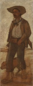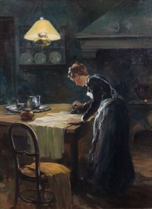 Olio su cartone, cm. 70,4x50 Titolo e firma in basso a destra: Contadina al fu[oco] / E. Chaplin. Storia Eredità [..]