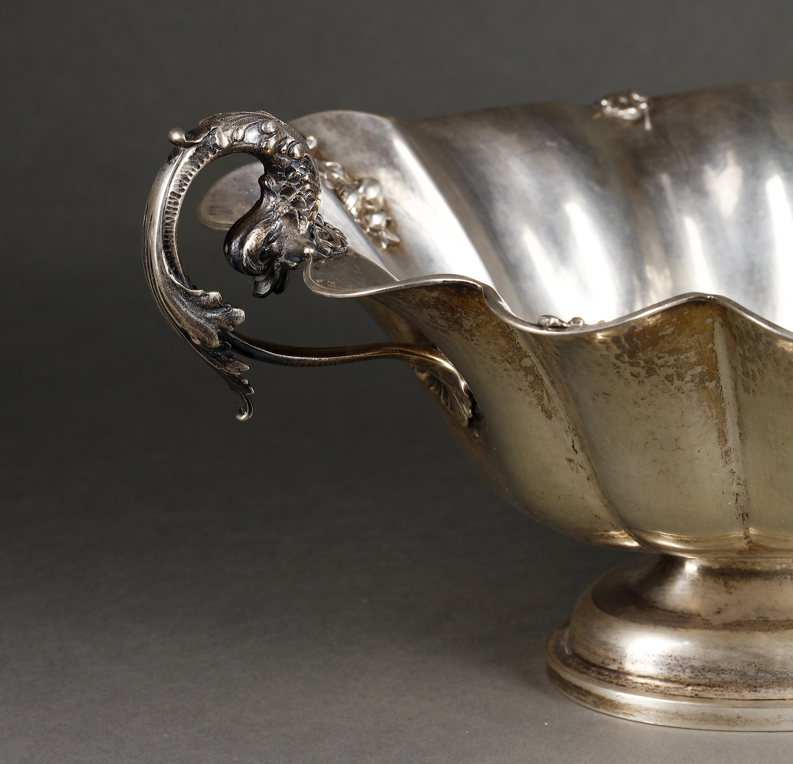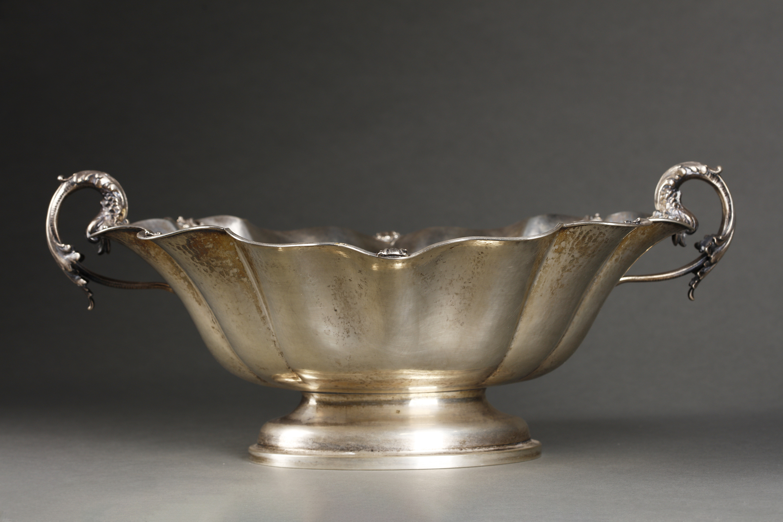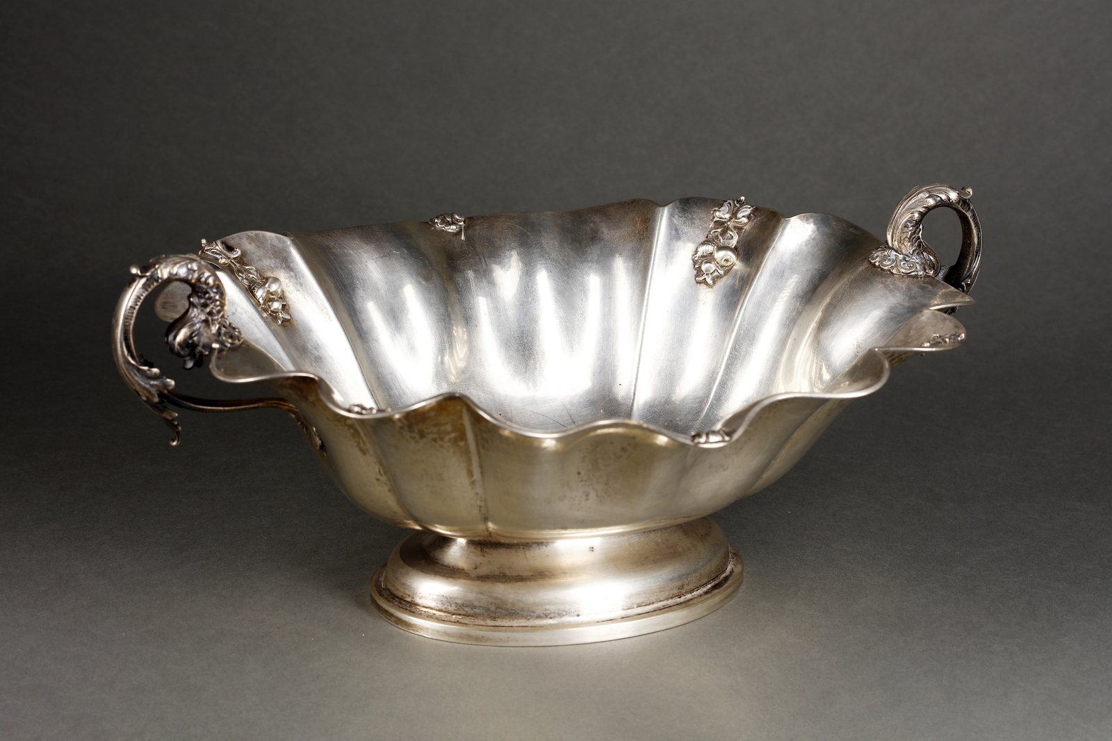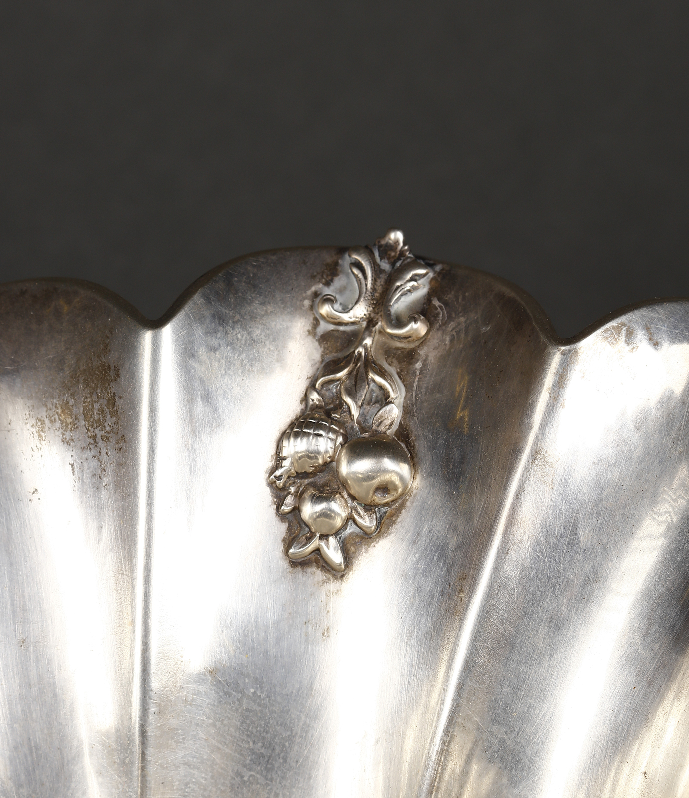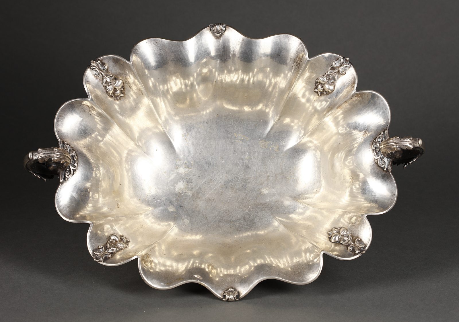 Alzata centrotavola in argento con bordo mistilineo e decorazioni vegetali a rilievo, [..]