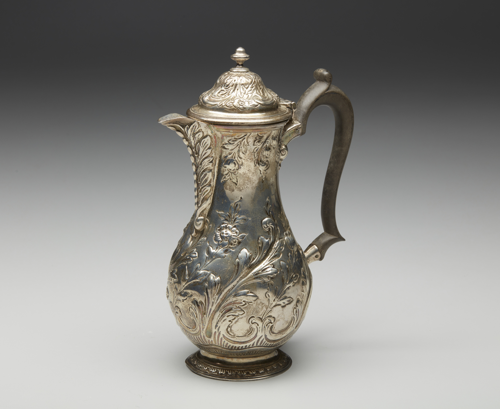 Caffetteria in argento sbalzato e cesellato con motivi fitomorfi, corpo piriforme, [..]