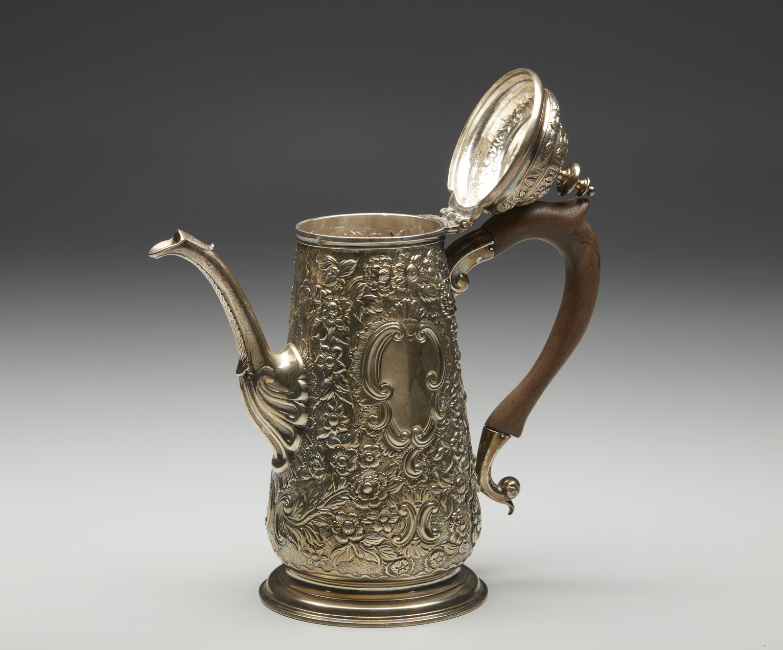 Caffettiera in argento cesellata a motivi floreali e fitomorfi in rilievo, manico [..]
