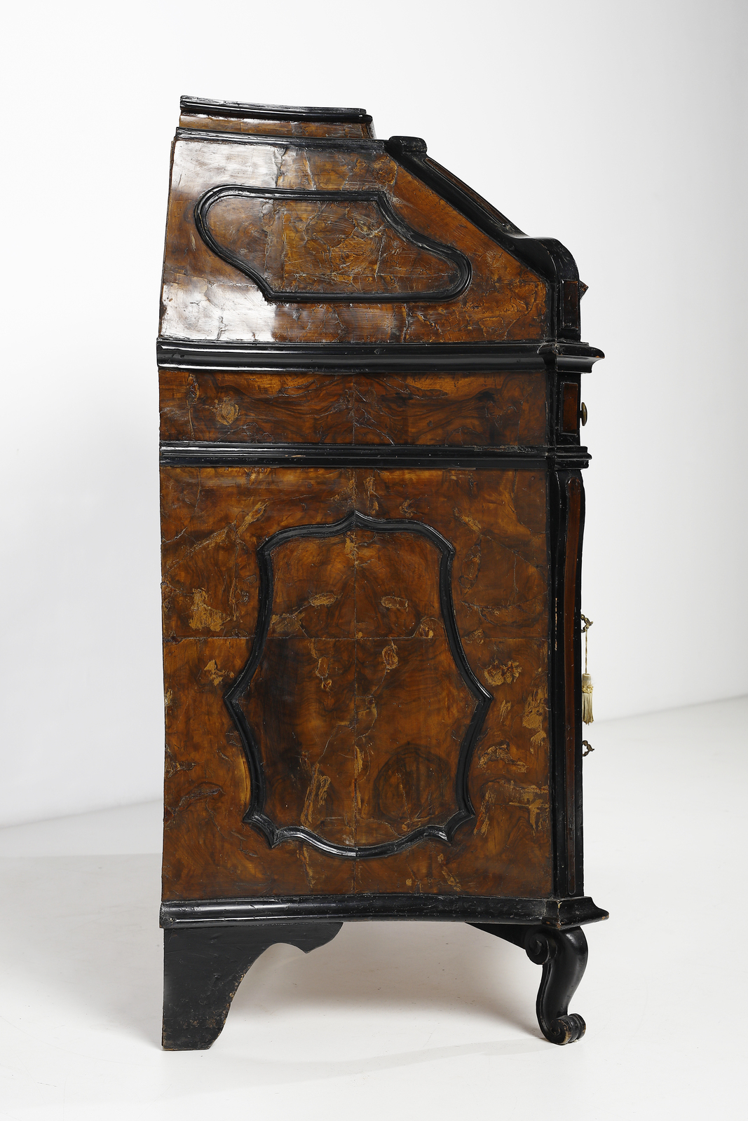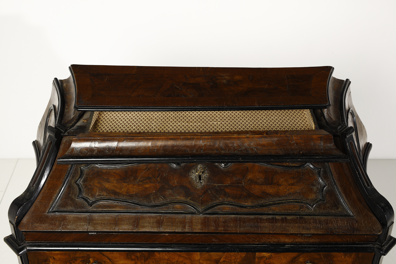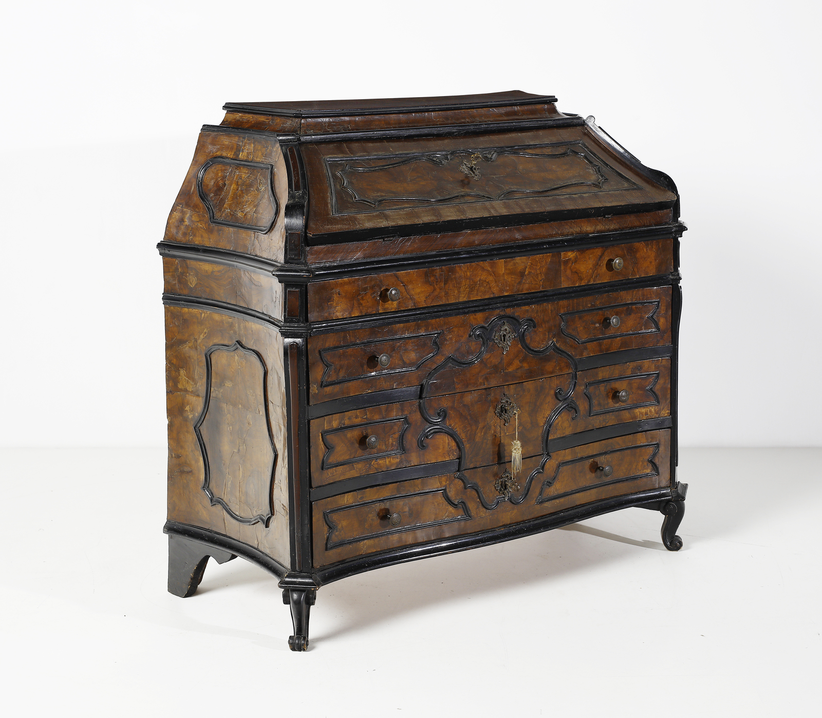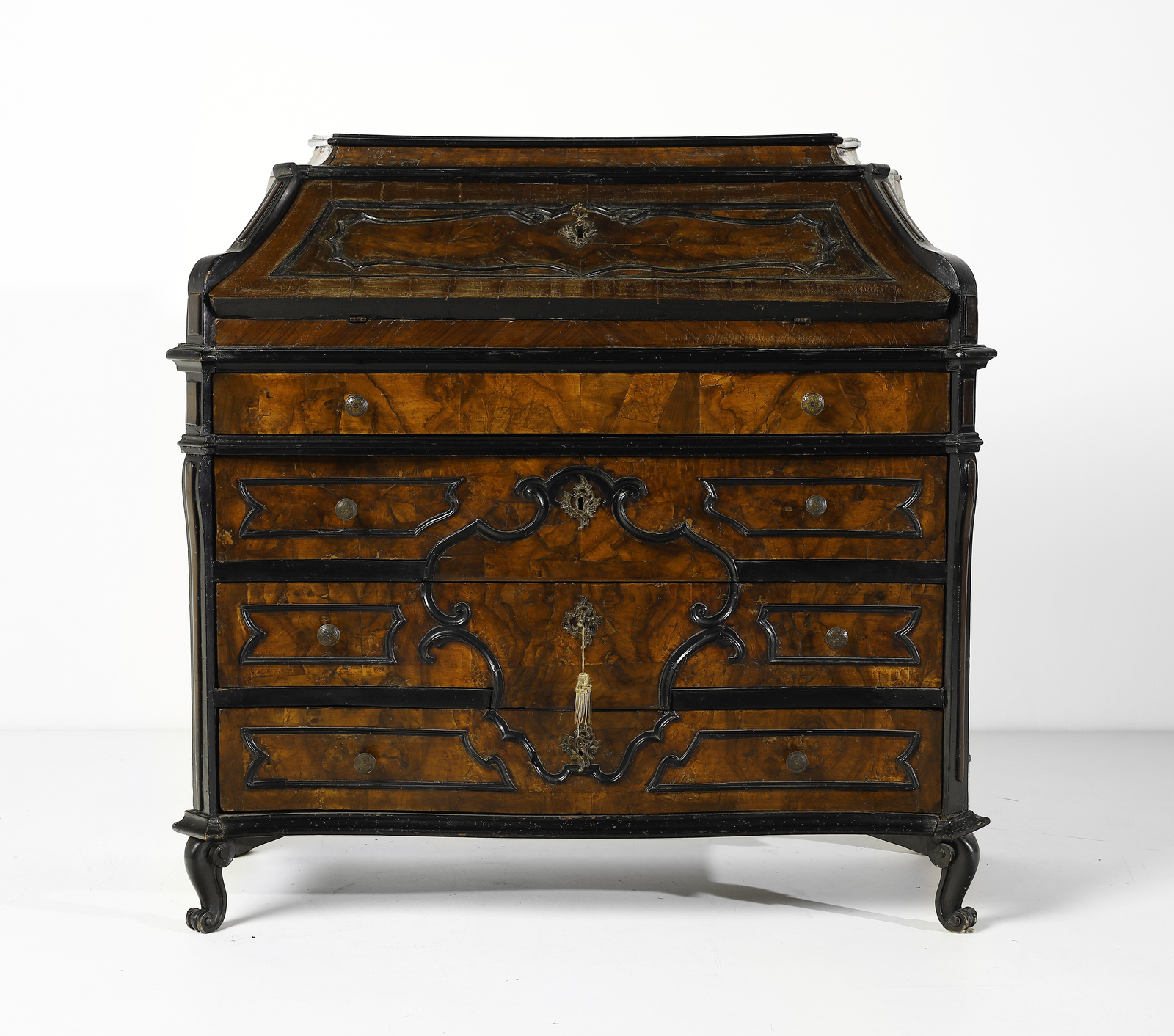 Cassettone a ribalta impiallacciato in radica di noce con cornici modanate in legno [..]