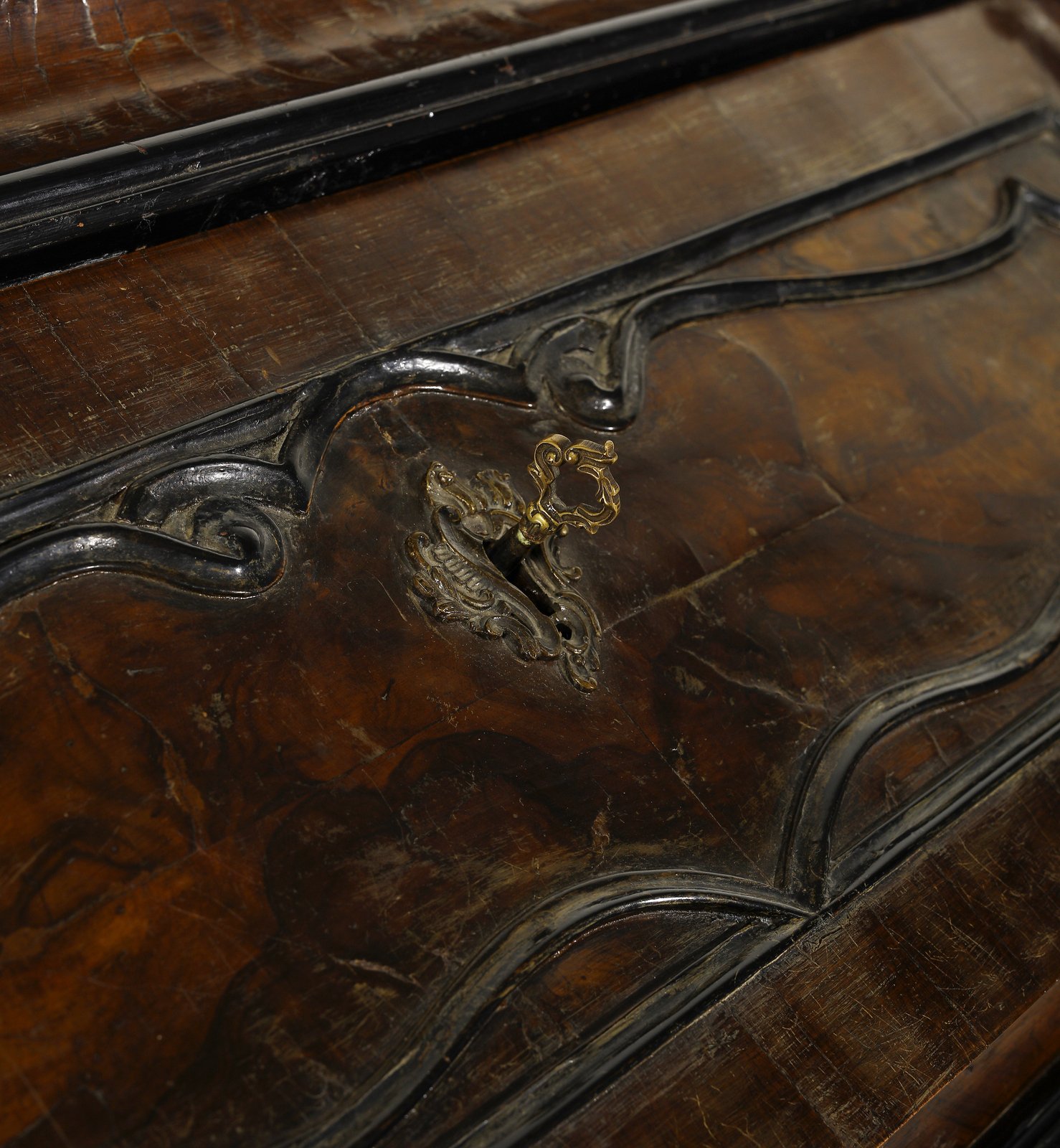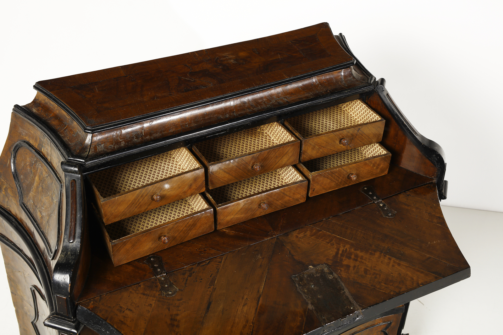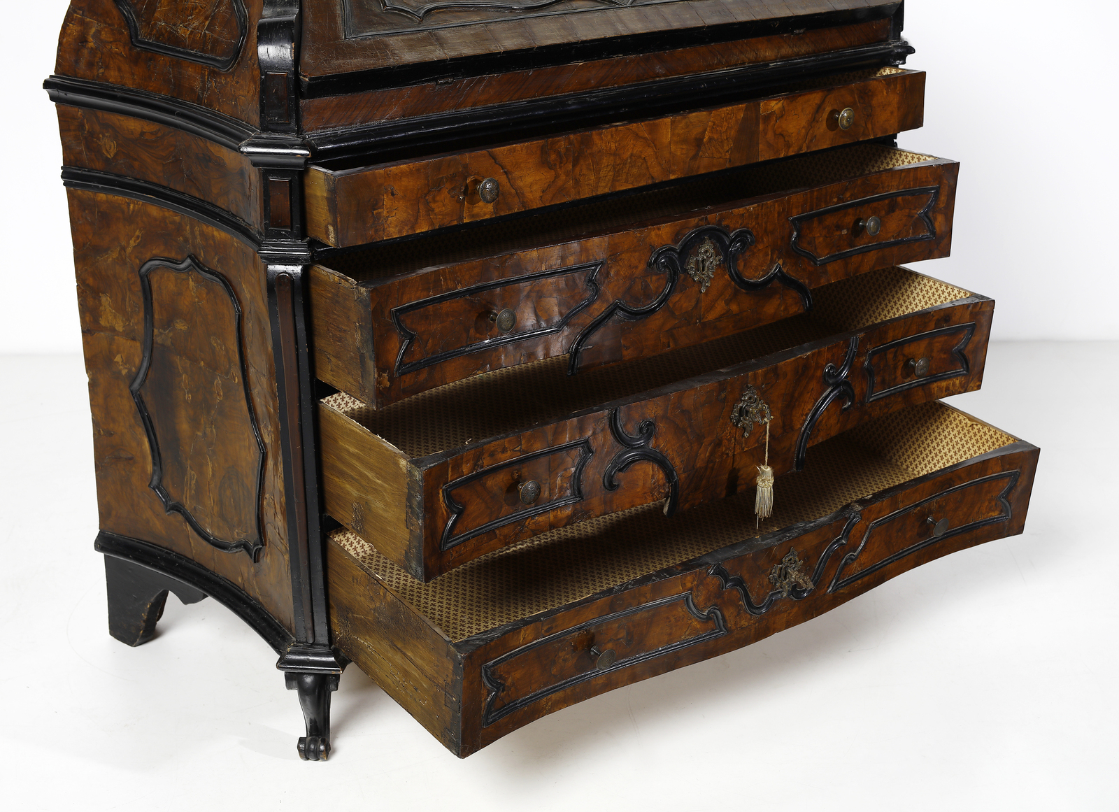 Cassettone a ribalta impiallacciato in radica di noce con cornici modanate in legno [..]