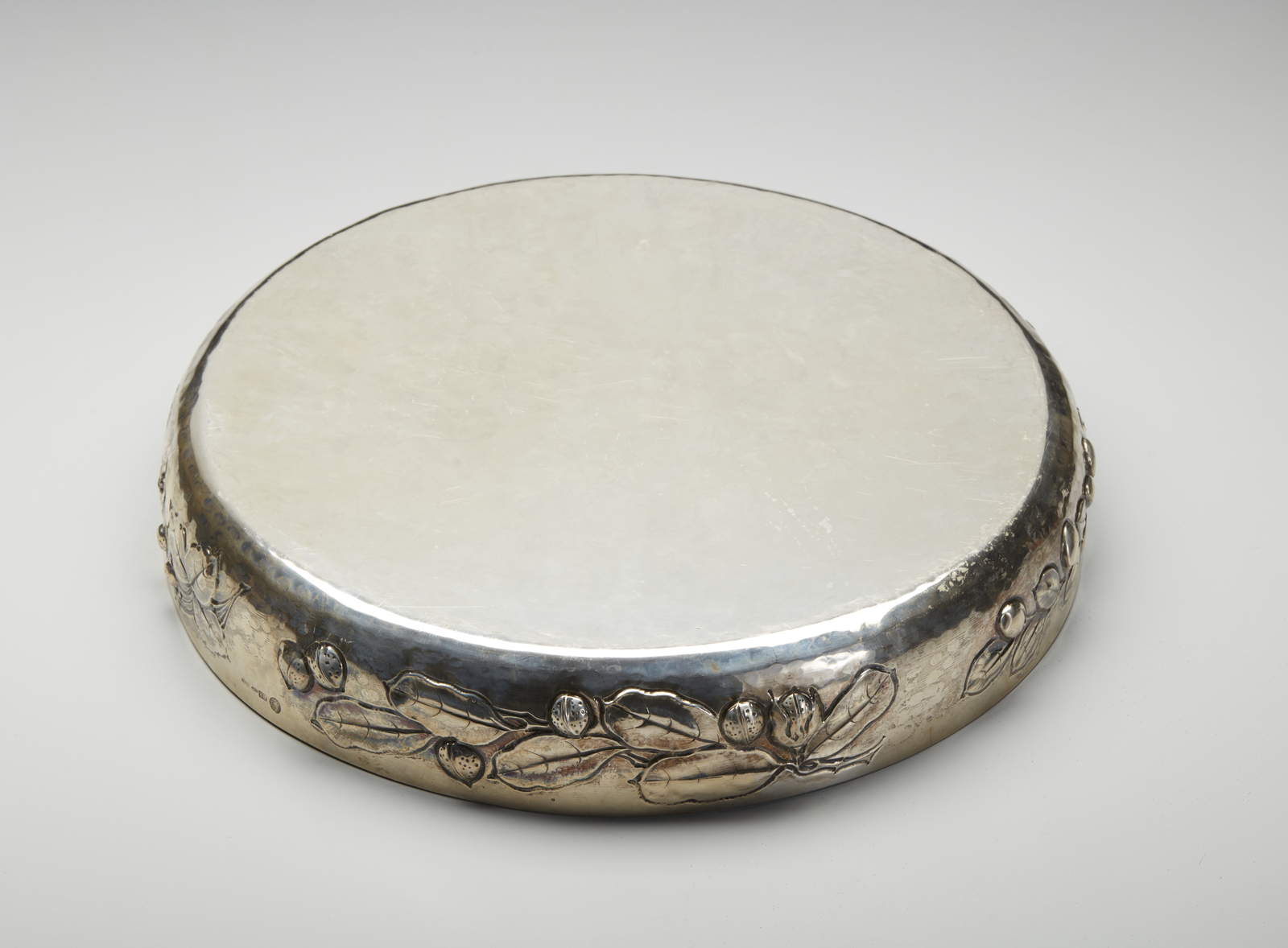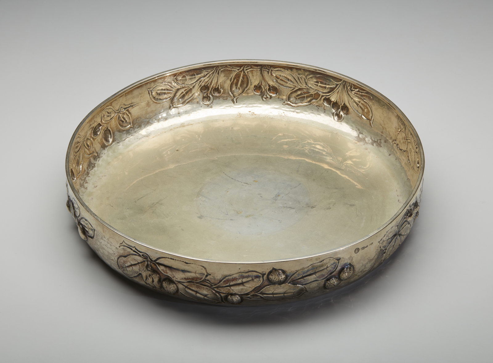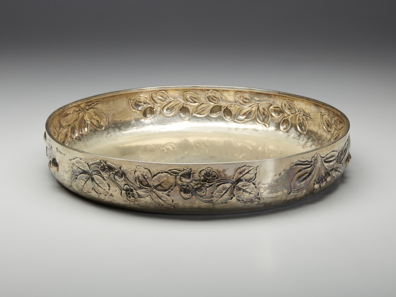 Centrotavola in argento decorato con motivi di foglie e frutti