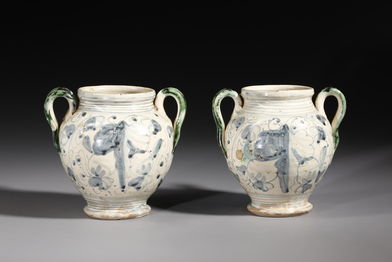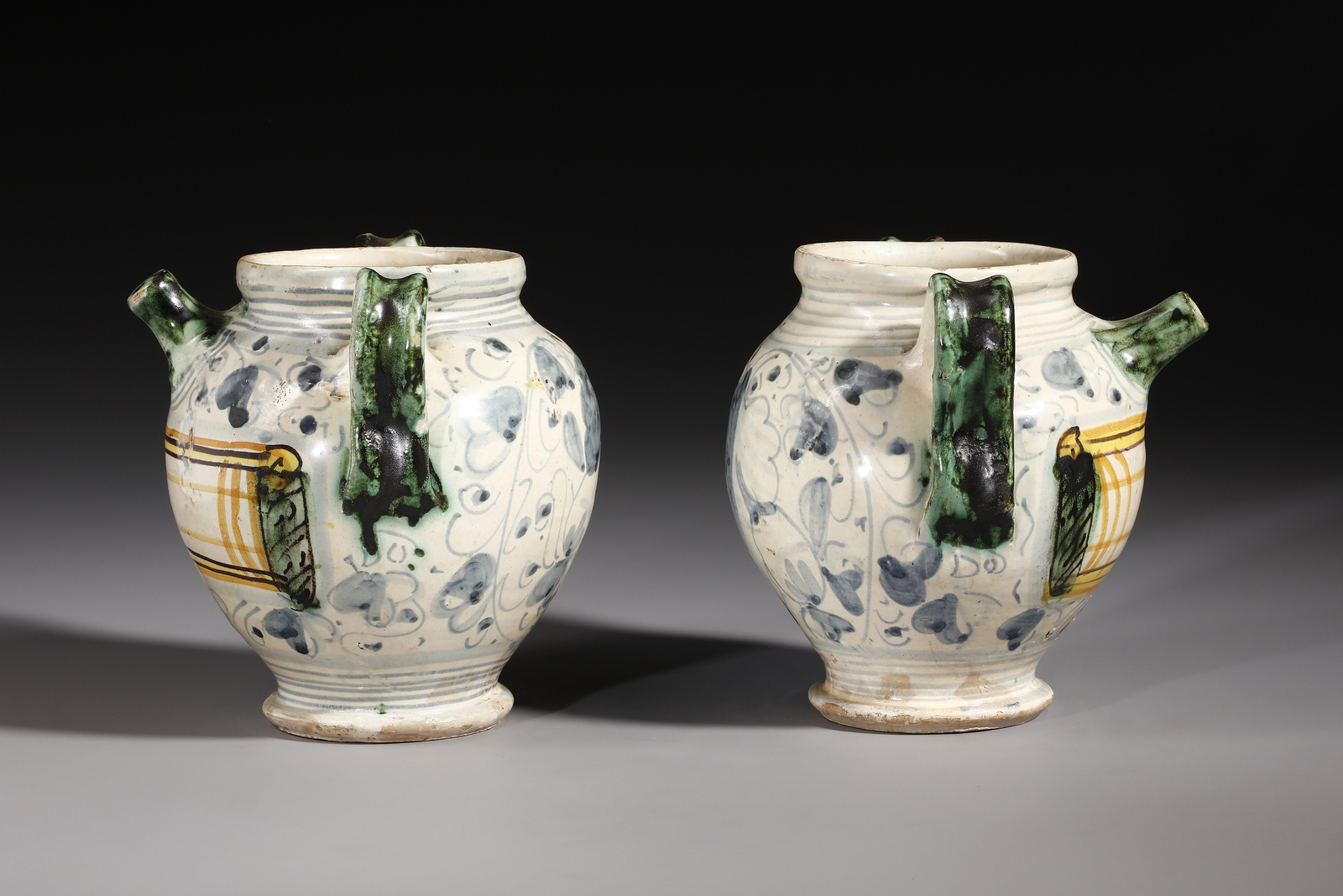 Coppia di orcioli in maiolica policroma con beccuccio, biansati e con decoro a cartiglio [..]
