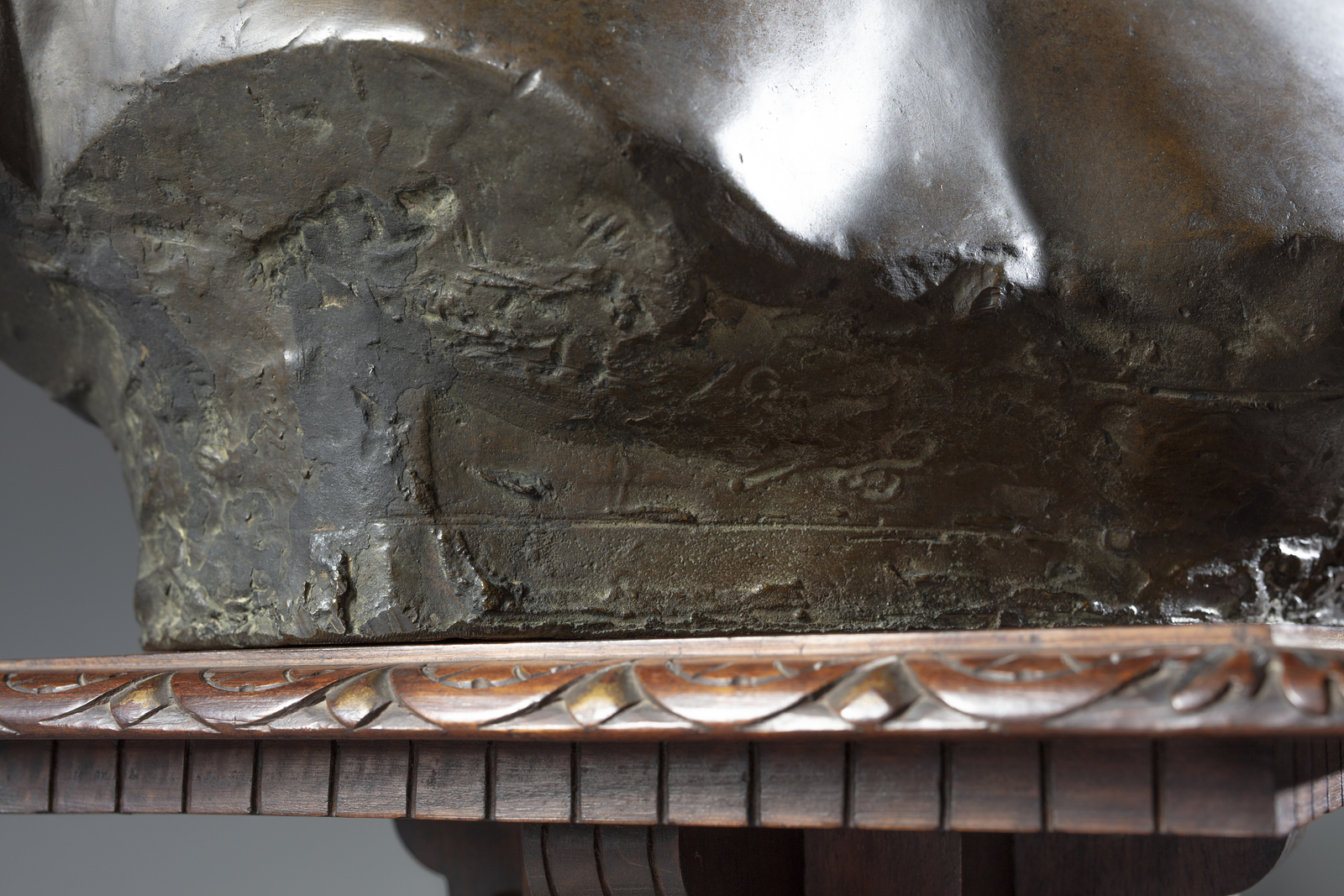 Firmato al retro e timbro del fonditore ''Faruffini & Ottolina fusero Milano''. Su piedistallo originale in legno intagliato (120x32,5x32,5 cm).Provenienza: Atelier dell'artista. Eredi dell'artista.Bibliografia di riferimento: G. Gattoni, ''Enrico Cassi: scultore 1863-1913'', Saltrio 2013, pp. 72-74.La versione in marmo della ''Donna lombarda'' fu esposta nel 1898 a Venezia e poi riproposta alla Mostra della Società Promotrice di Belle Arti di Torino del 1899, dove fu acquistata dal Comune per il Museo Civico di Arte Moderna della città. Nel 1910 Cassi realizzò una copia di questo marmo che fu proposta, con successo, all'Esposizione di Buenos Aires.