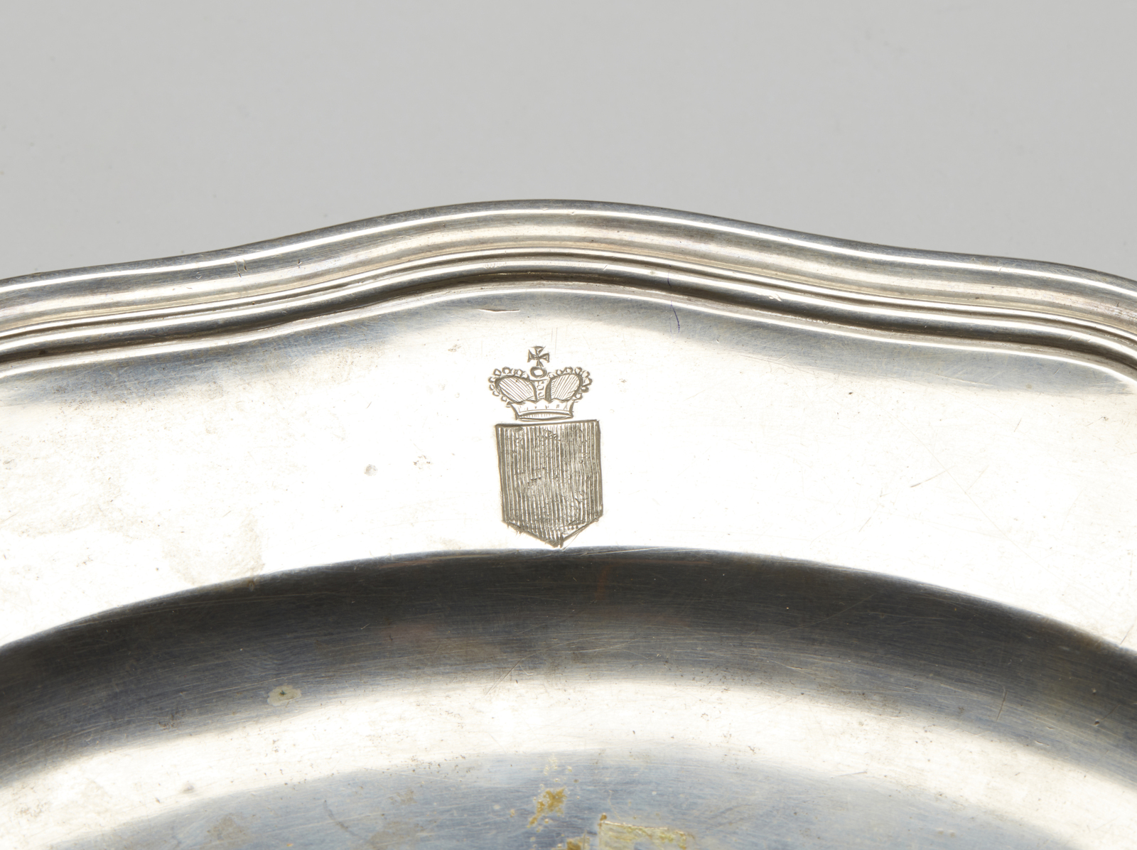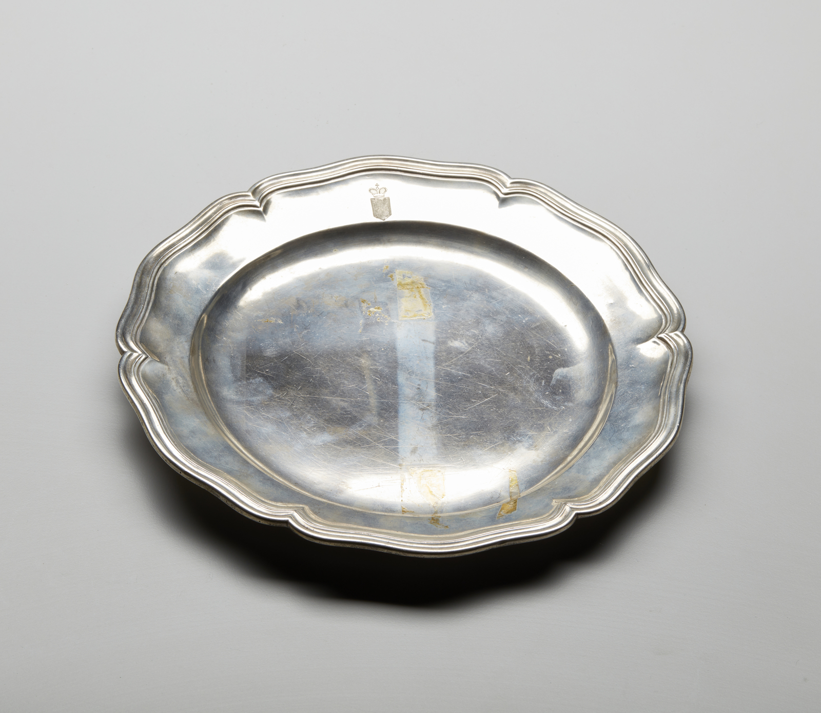 Piatto in argento sbalzato di forma circolare con bordo mistilineo, stemma coronato [..]