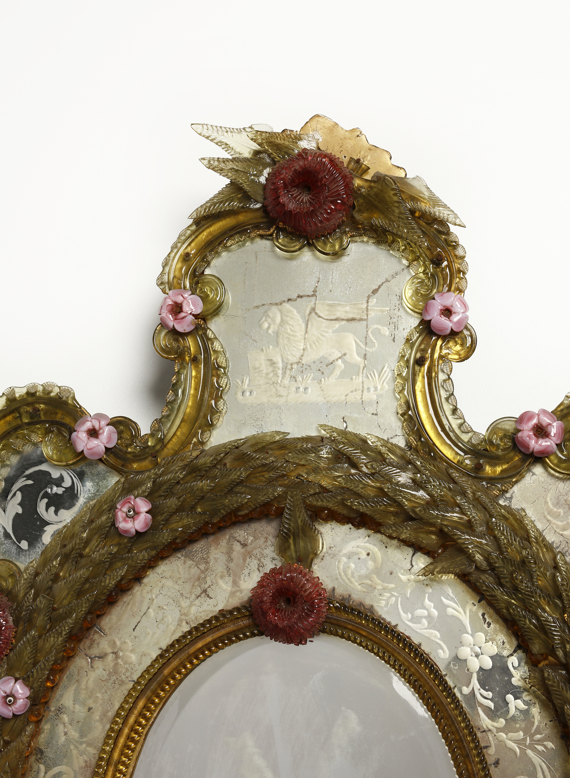Specchiera con cornice in vetro con elementi fitomorfi e fiori applicati