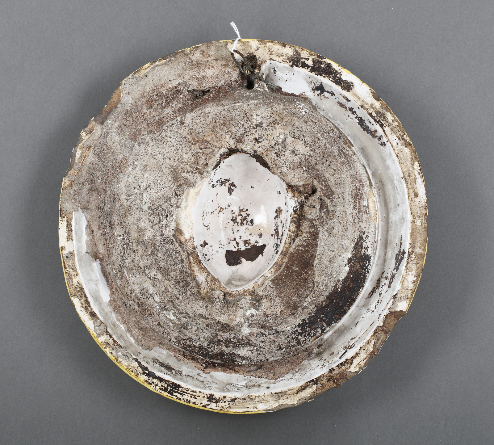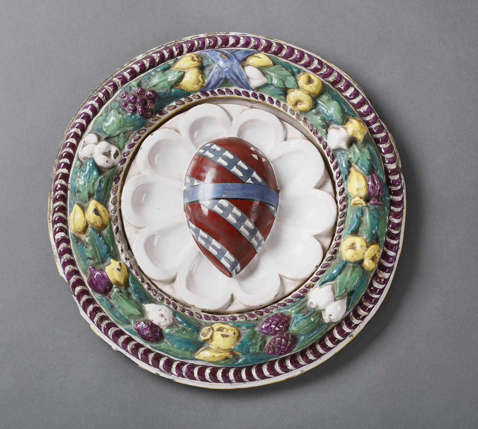 Stemma gentilizio entro ghirlanda circolare di fiori e frutta in terracotta invetriata [..]