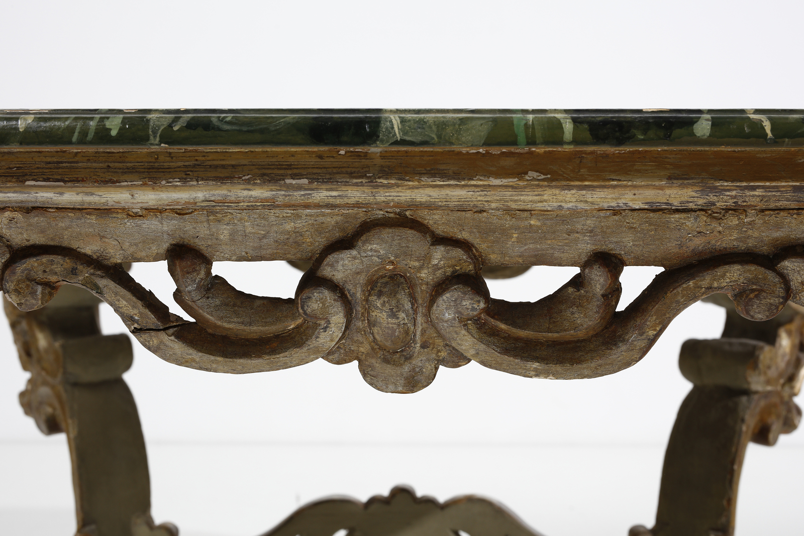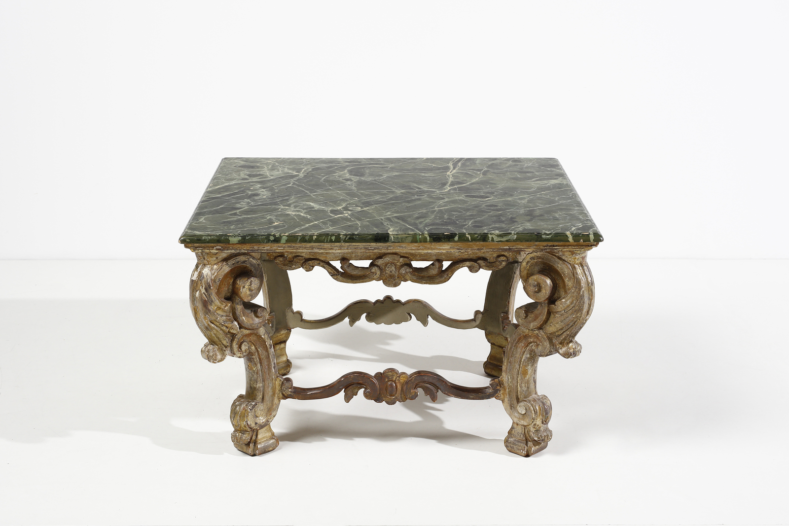 Tavolo basso in legno intagliato, parzialmente dorato e decorato a volute, gambe [..]