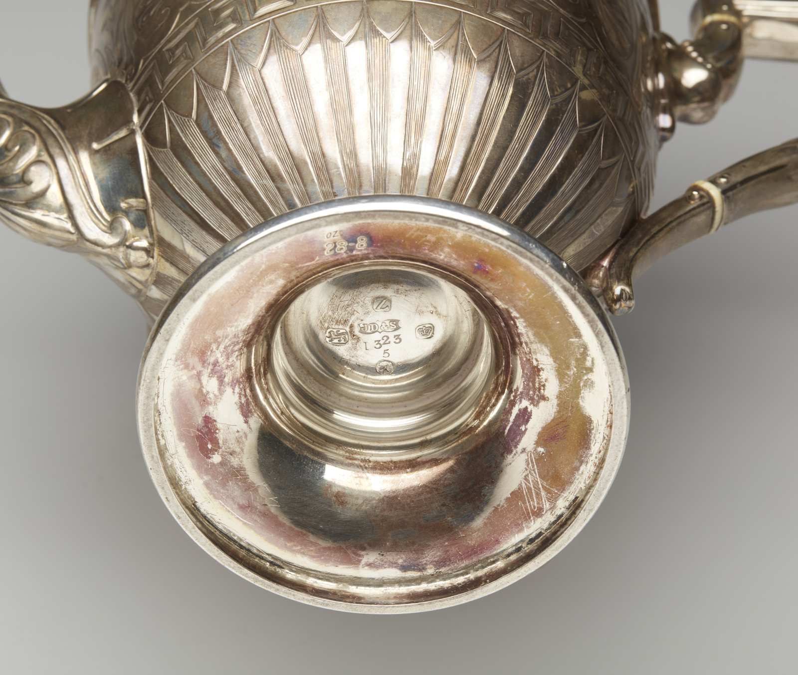 Teiera in argento cesellato con decorazioni a motivo a palmette e a meandro, poggiante [..]