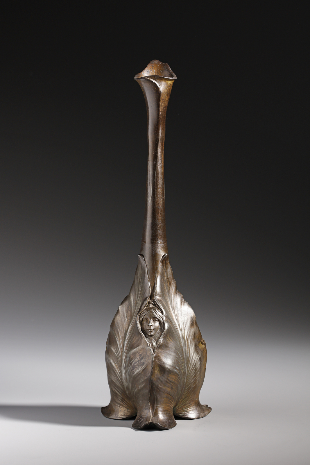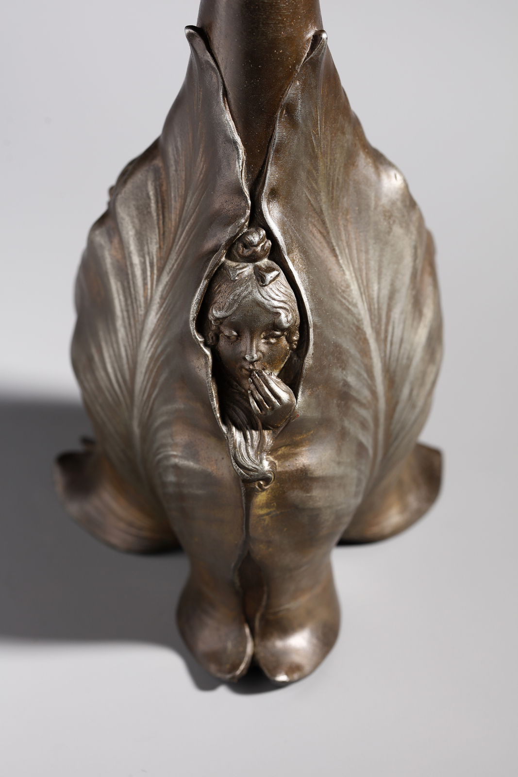 Vaso a balaustro in metallo in forma di stelo da cui emergono delle figure femmi [..]
