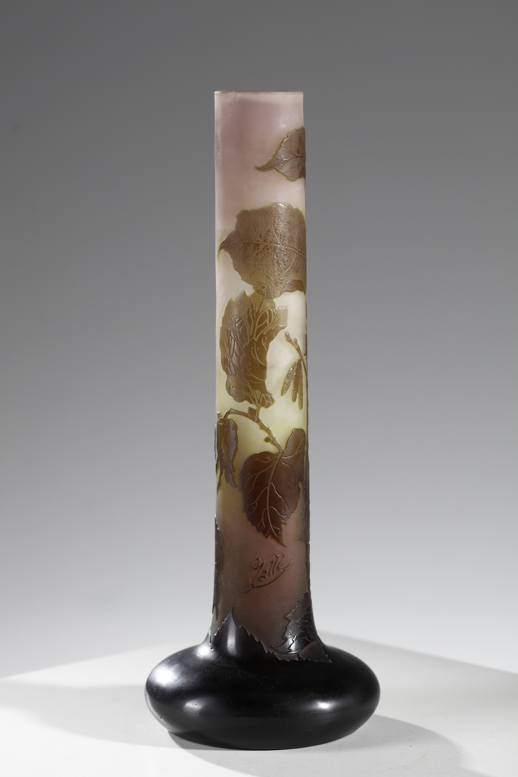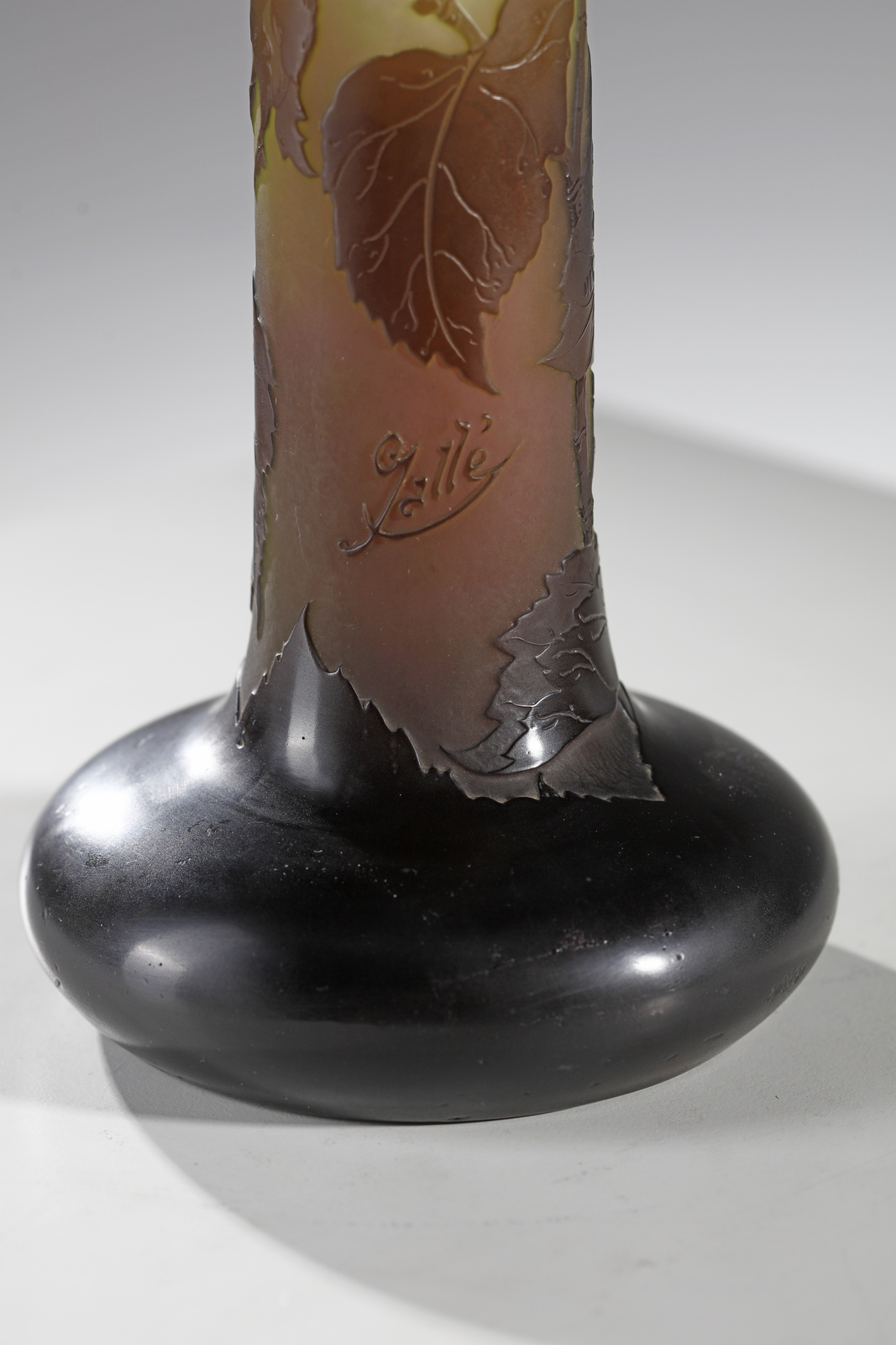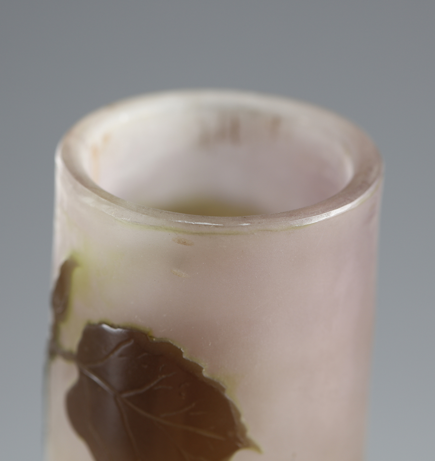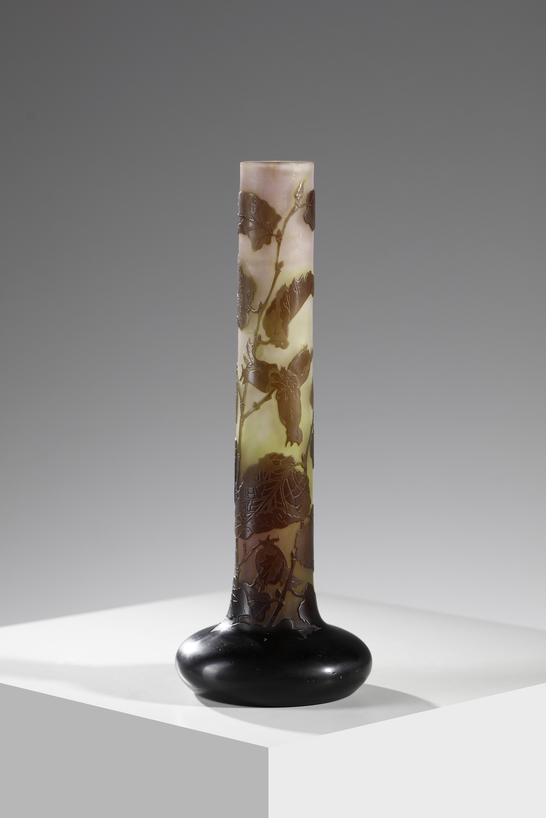 Vaso cilindrico con base a bulbo in vetro doppio, decoro di foglie nei toni del [..]