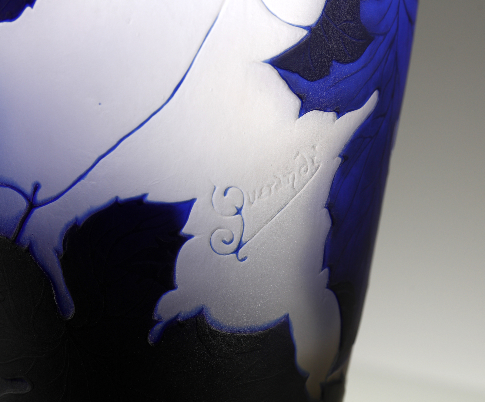 Vaso in vetro doppio, con decori vegetali, nei toni del blu su fondo bianco