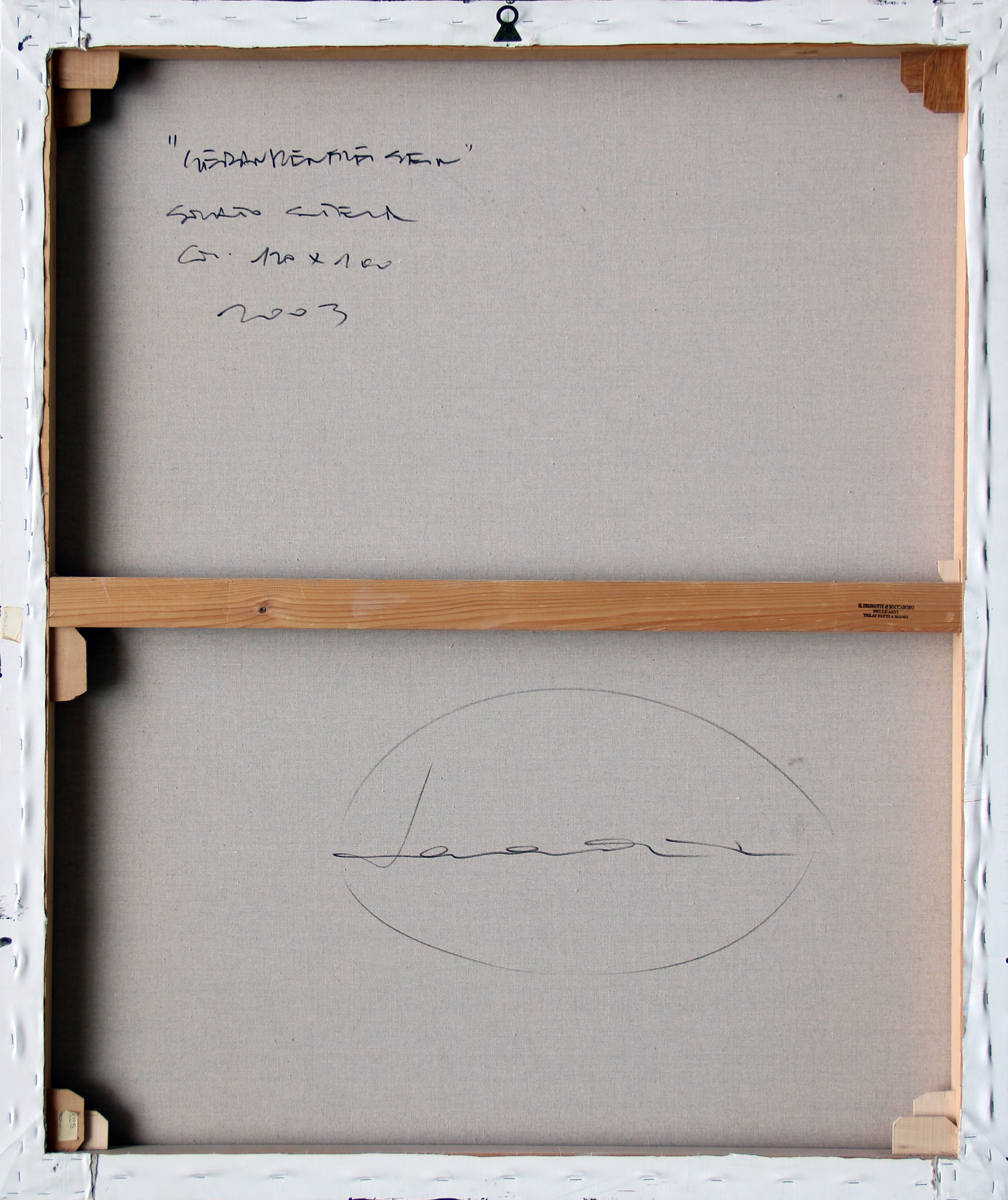 2003 Titolo, tecnica, misure, data, firma Gedankenfrei sein, smalto su tela, cm 120x100, 2003, Leonida De Filippi (al retro)