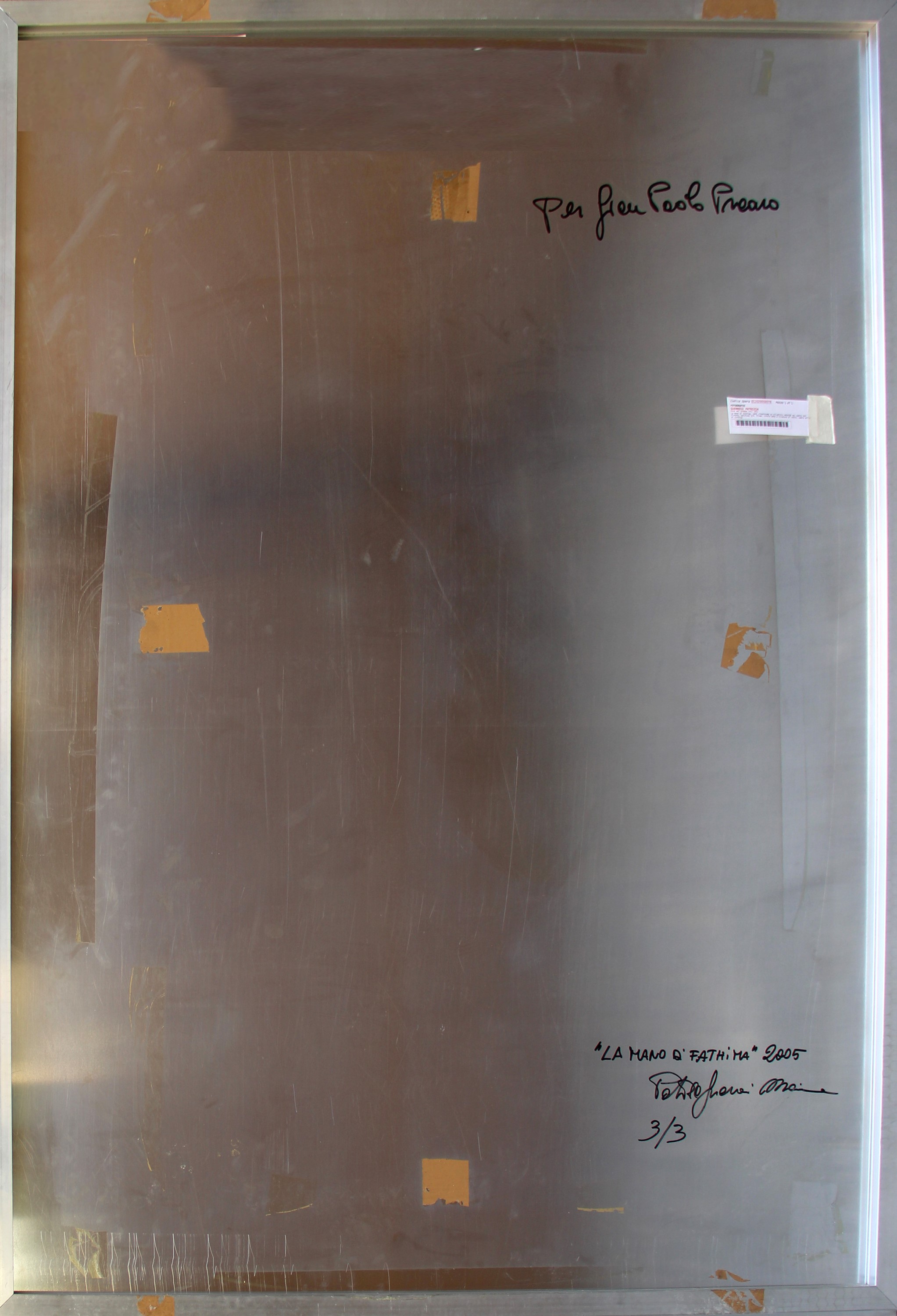 Dedica, titolo, data, firma, numerazione La mano di Fathima, 2005, Patrizia Guerresi Maïmouna, 3/3 (al retro)