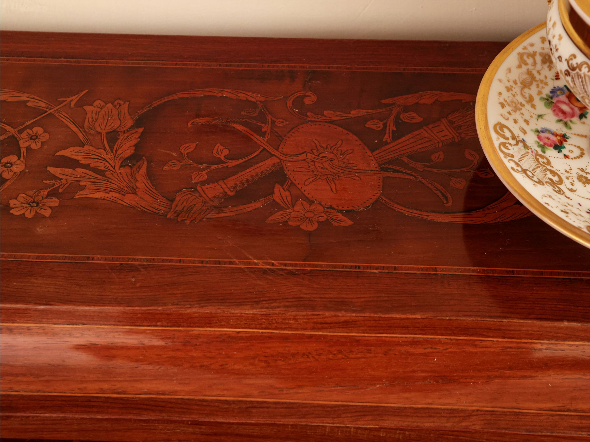 h cm 98x73x50 XX secolo di gusto settecentesco, scrittoio a rullo intarsiato con episodio della favola di Esopo La volpe e la cicogna, piano a tiretto rivestito in cuoio, gambe mosse, alcuni difetti