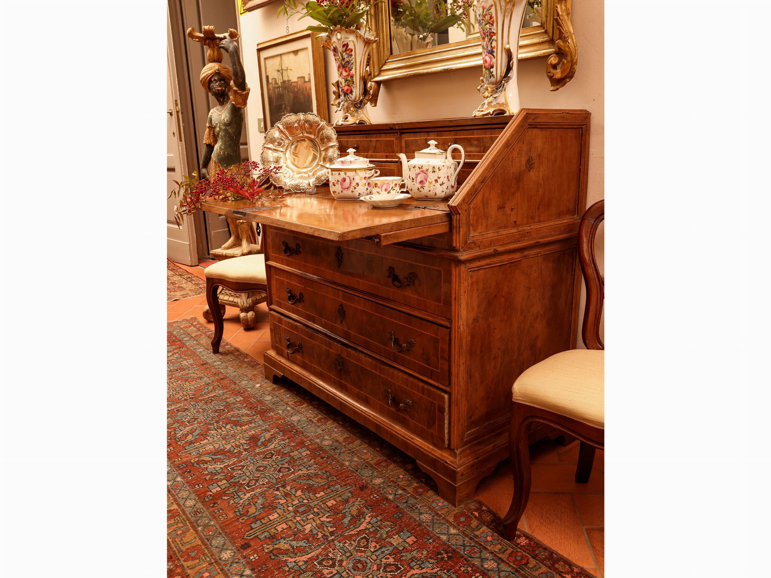Cassettone a ribalta impiallacciato in noce e intarsiato in legni di frutto
