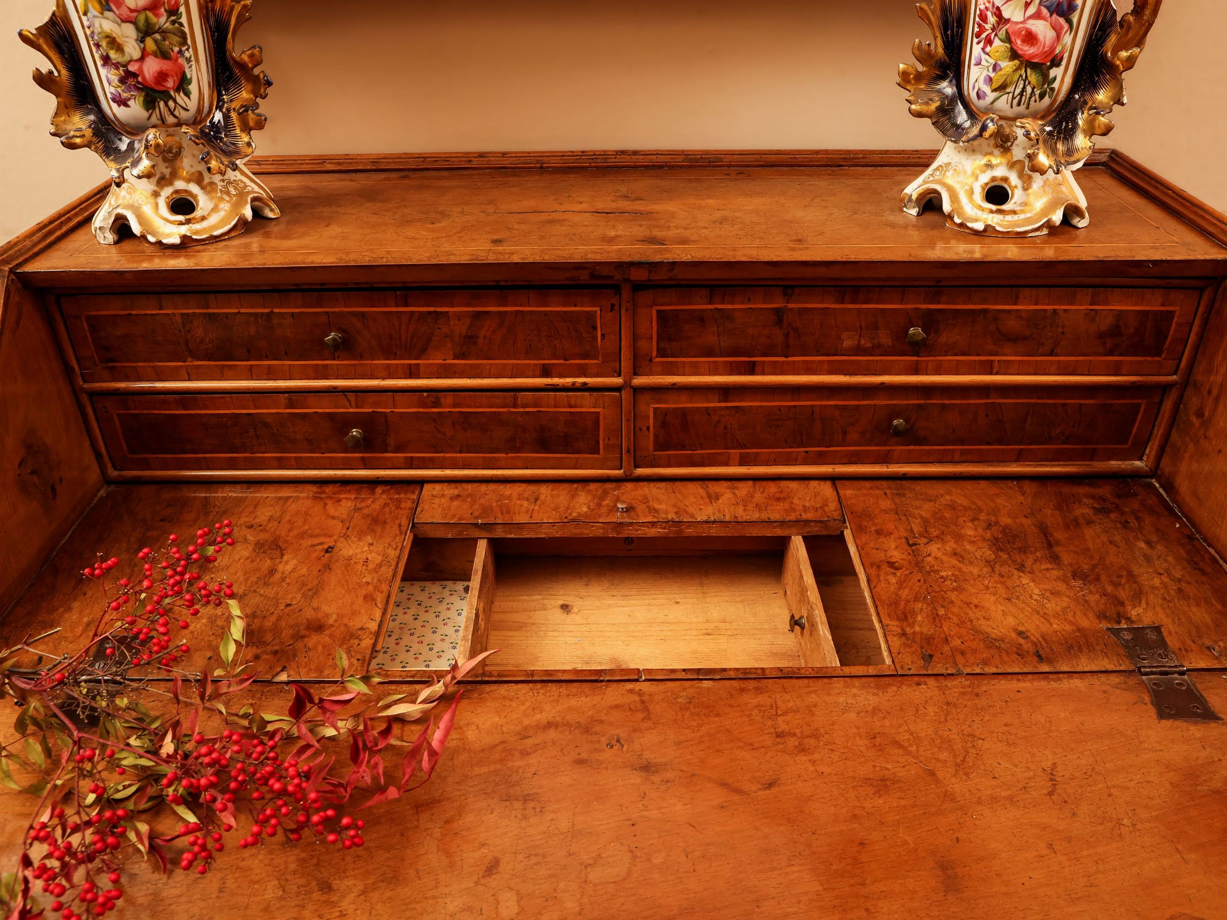 h cm 106x109x56 fine del XVIII/inizio del XIX secolo tre cassetti sul fronte dritto, sportelli a calatoio, scarabattolo con quattro cassettini e vano segreto, piedi a mensola