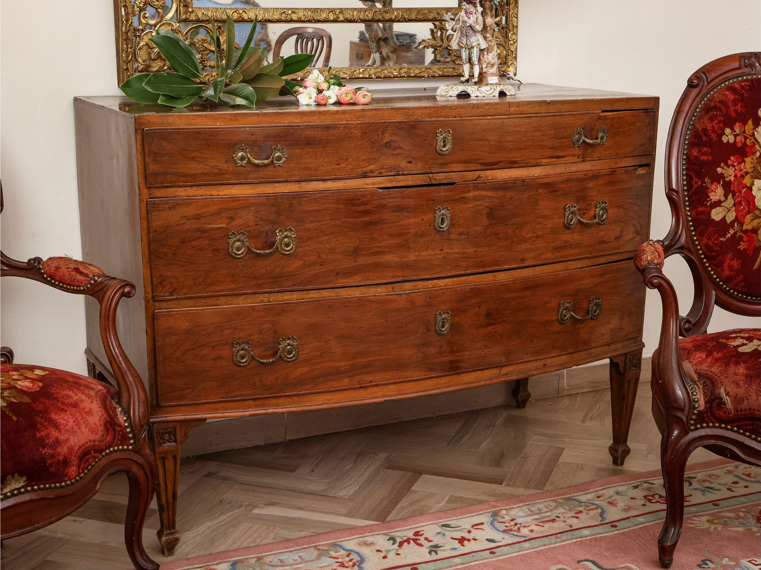 fine del XVIII secolo tre cassetti sul fronte leggermente bombato, piedi a faretra scanalata, alcuni difetti
