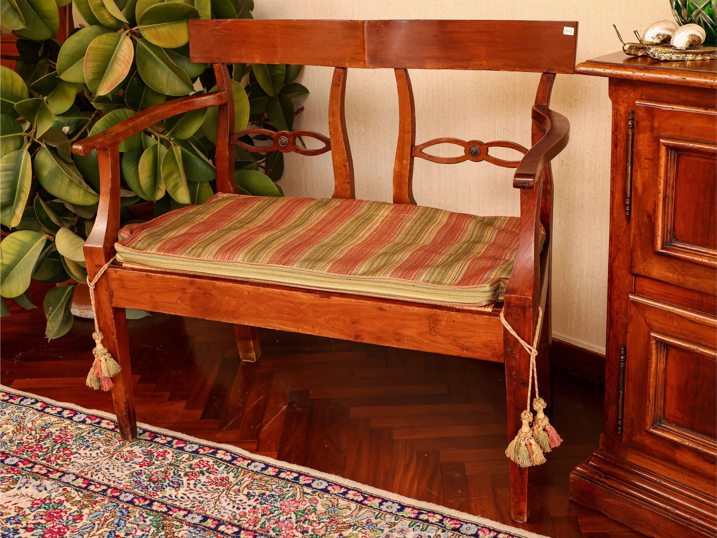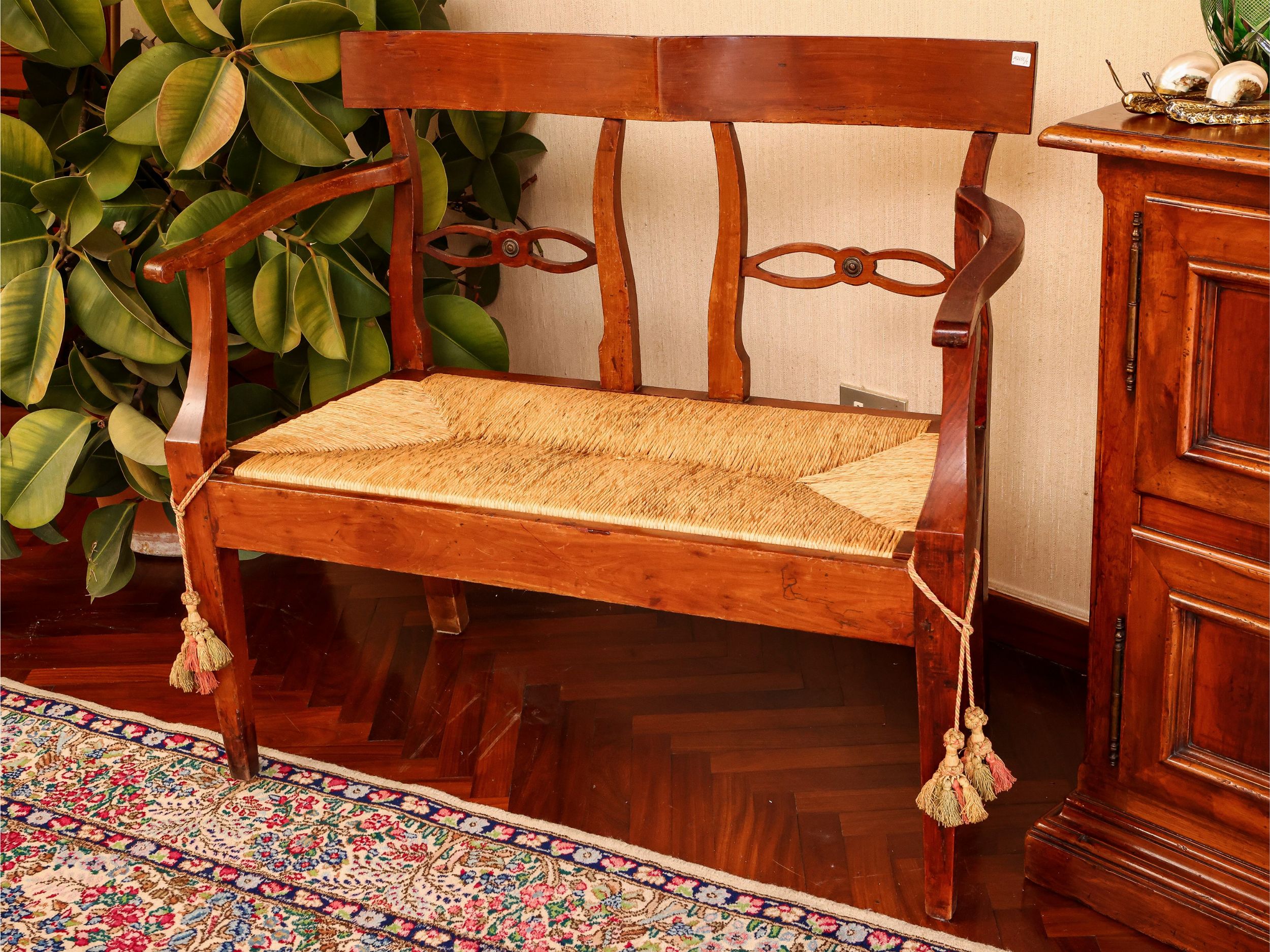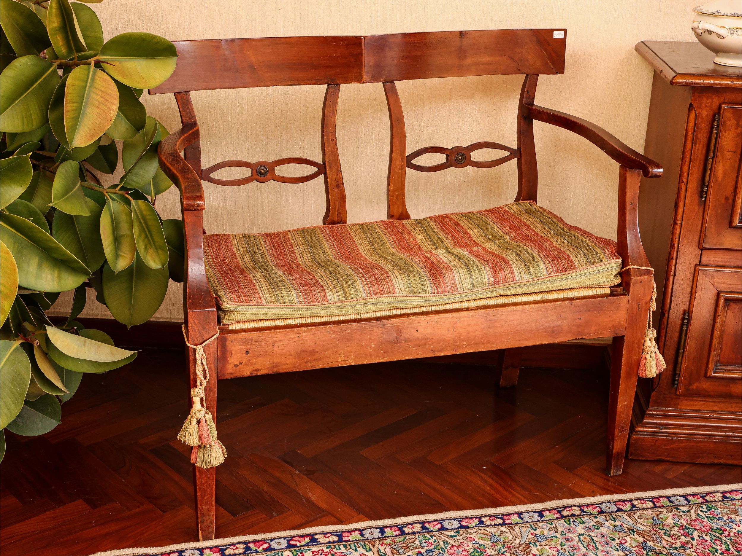 fine del XVIII secolo schienali a doppia cartella, braccioli a giorno, sedili impagliati corredati da cuscini rigati, gambe anteriori a faretra, le posteriori a sciabola
