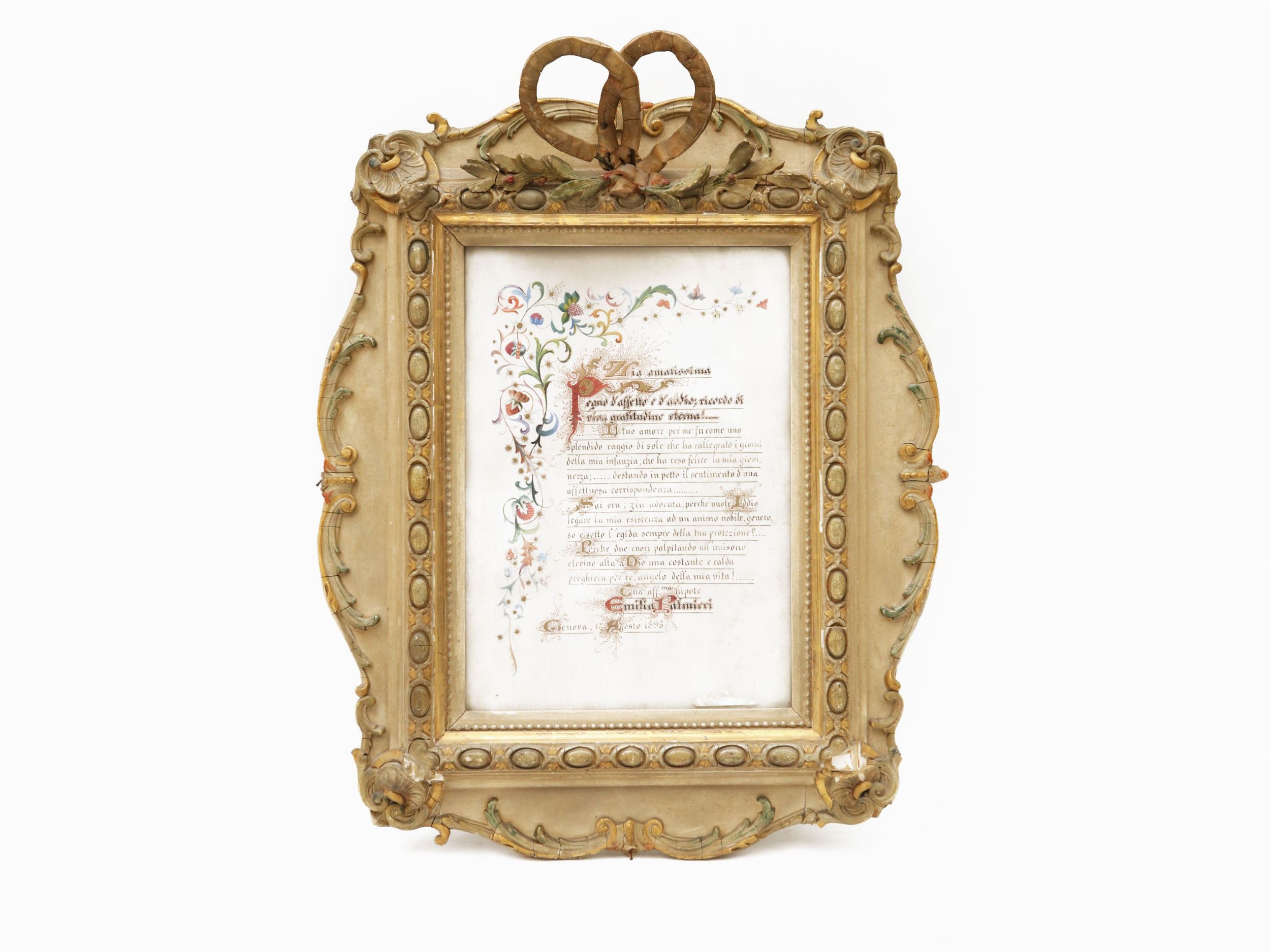 inizio del XX secolo contenente una pergamena con dedica, alcuni difetti