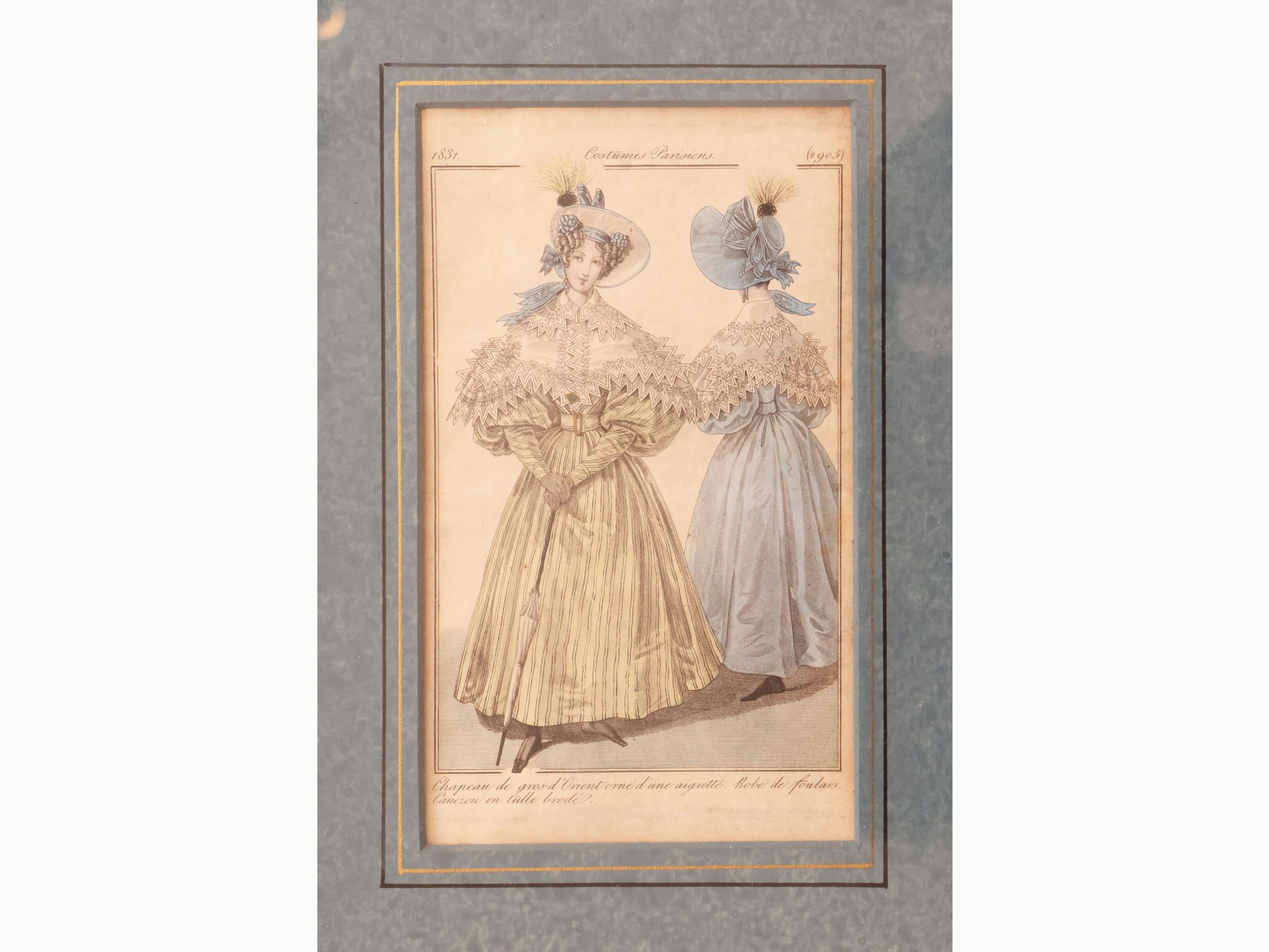 metà del XIX secolo serie di quattro figurini di moda, in cornice, difetti
