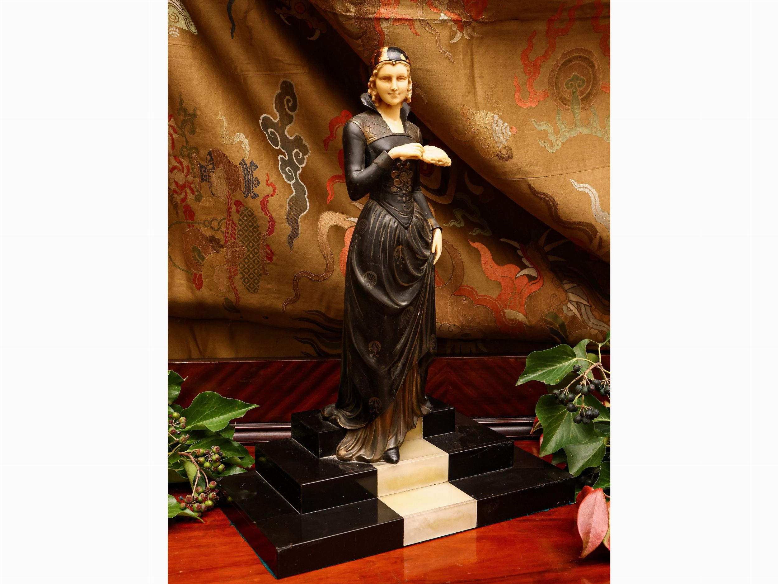 gruppo in metallo e avoriolina, su base in marmo, firmata Menneville, difetti