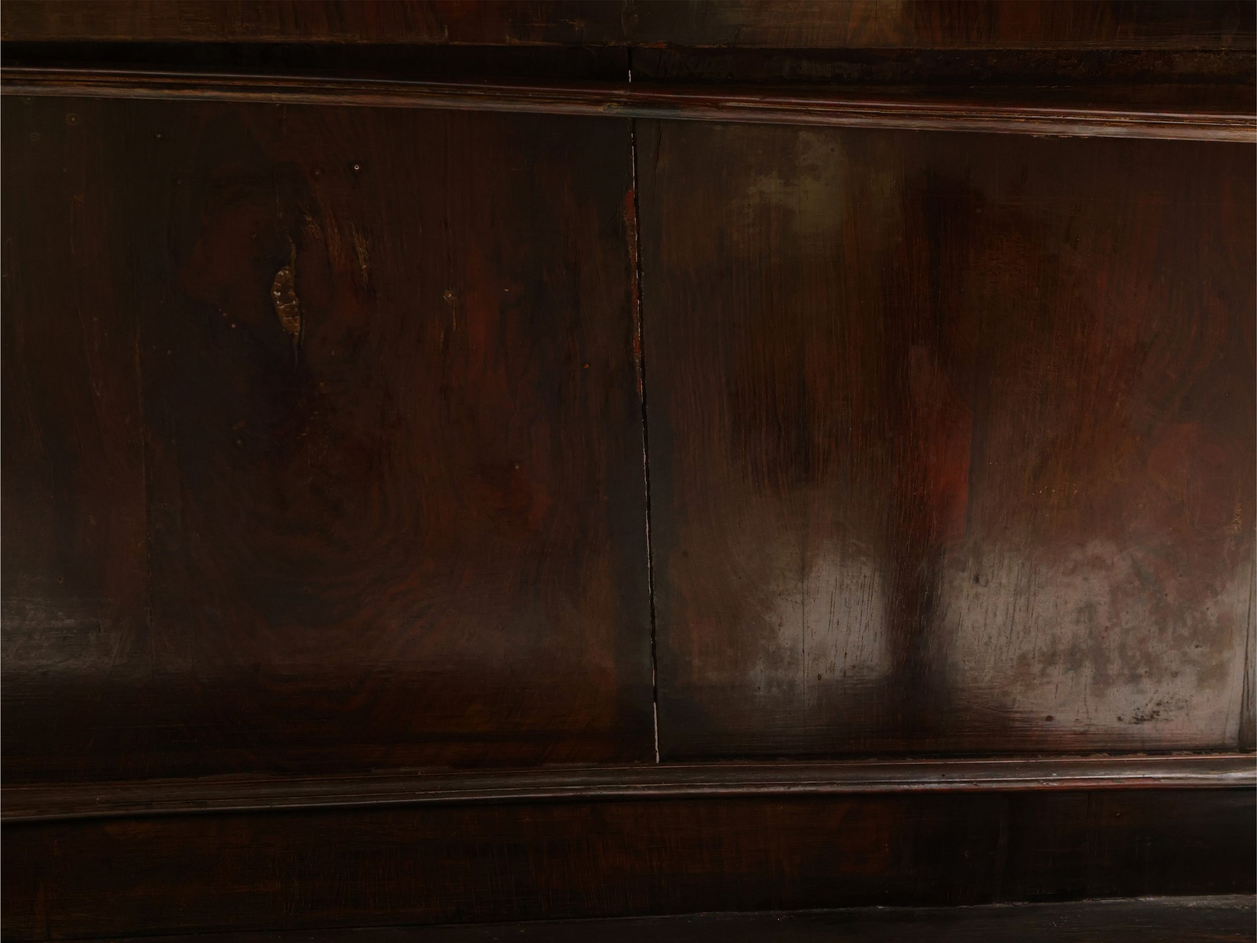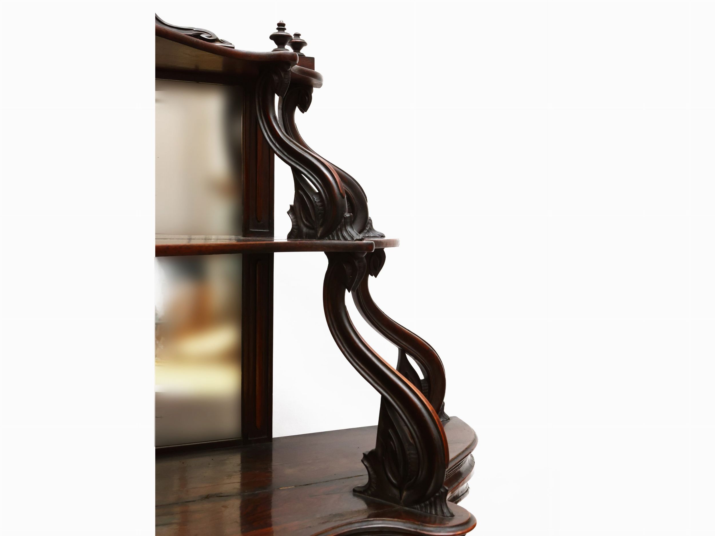 fine del XIX secolo cimasa intagliata con volute contrapposte, due ripiani sagomati tra montanti a volute, fondo a specchio, due ripiani nella parte inferiore, difetti e mancanze