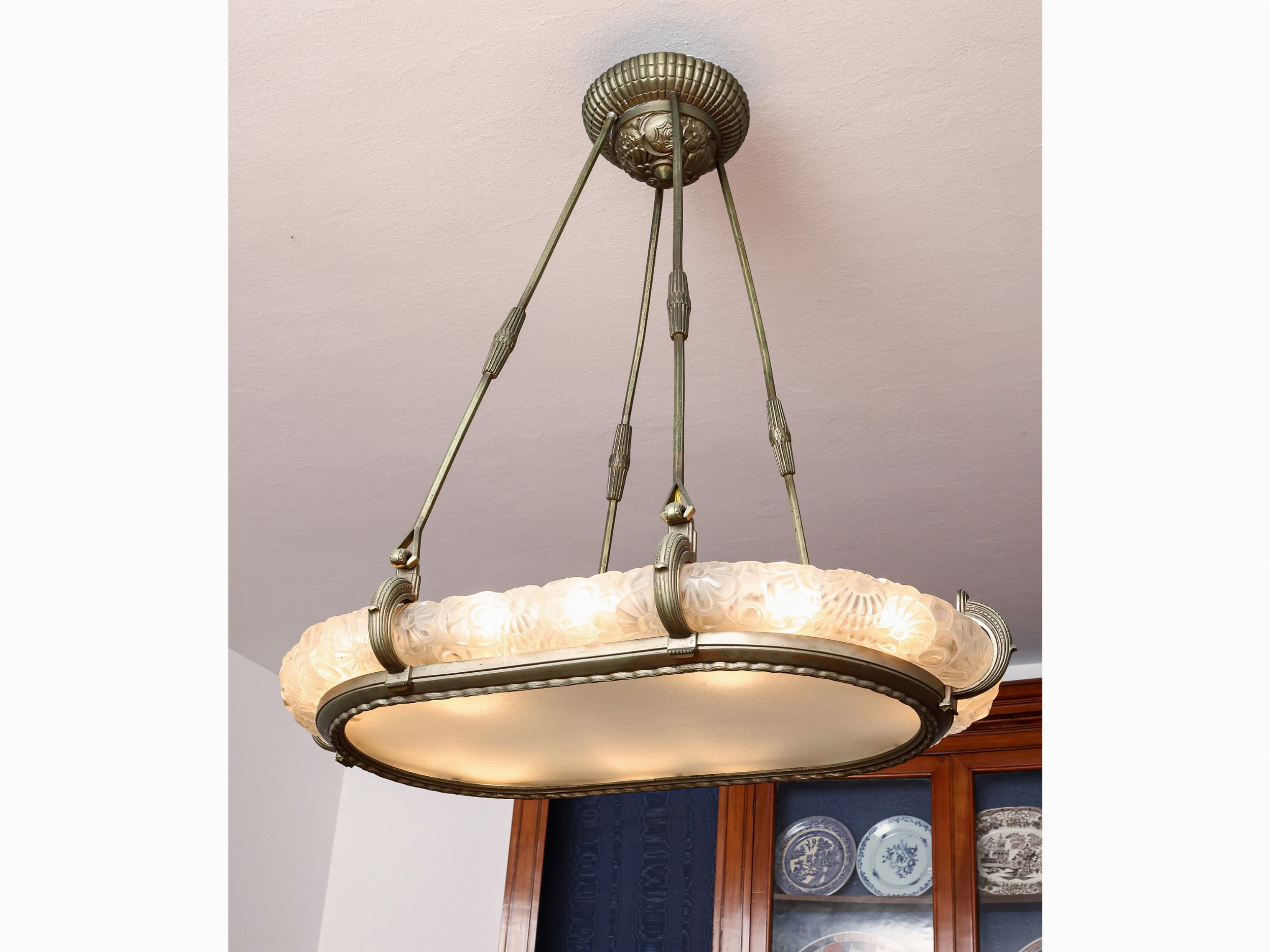 Grande lampadario Art Decò a sospensione in metallo e vetro acidato