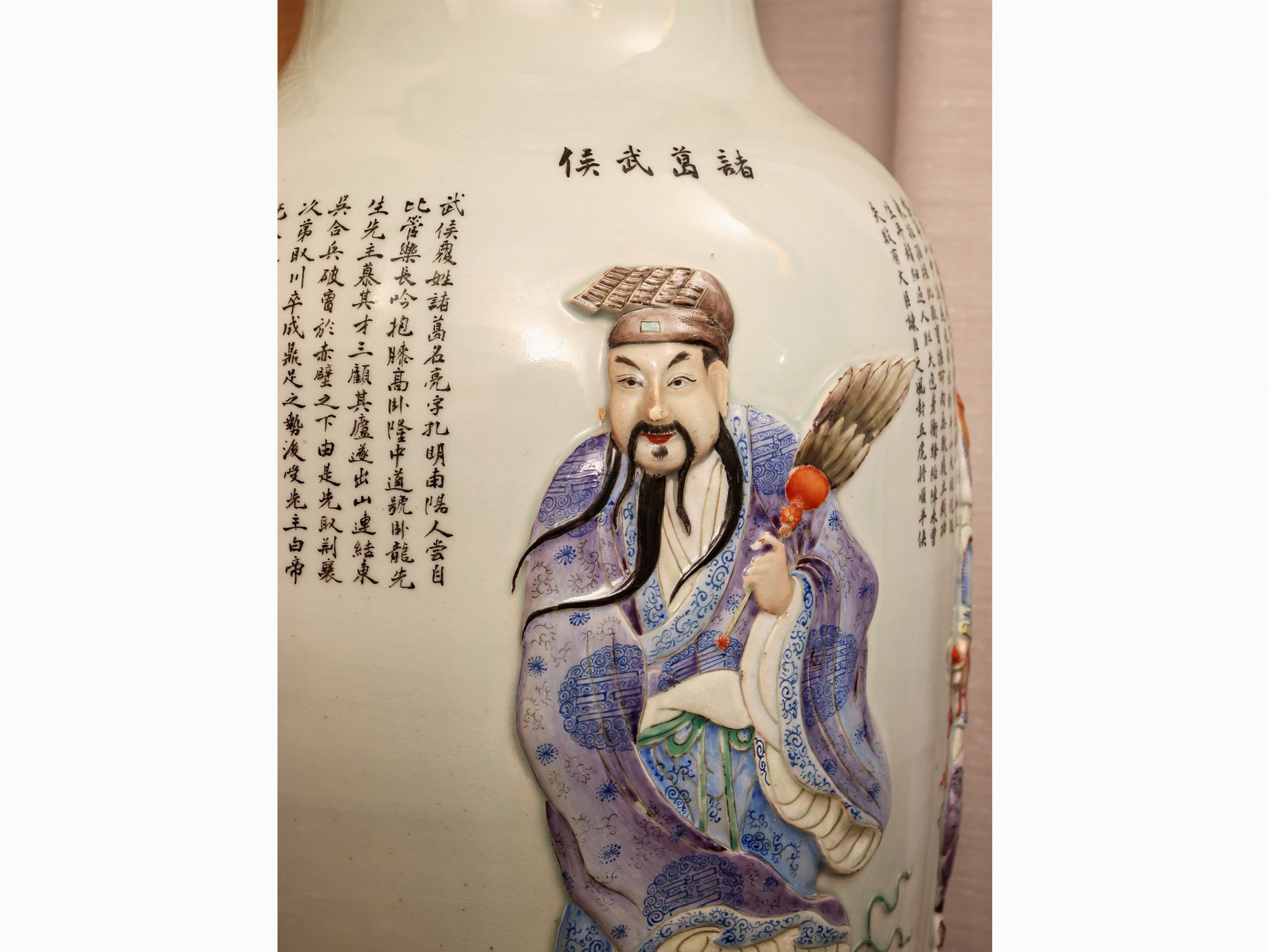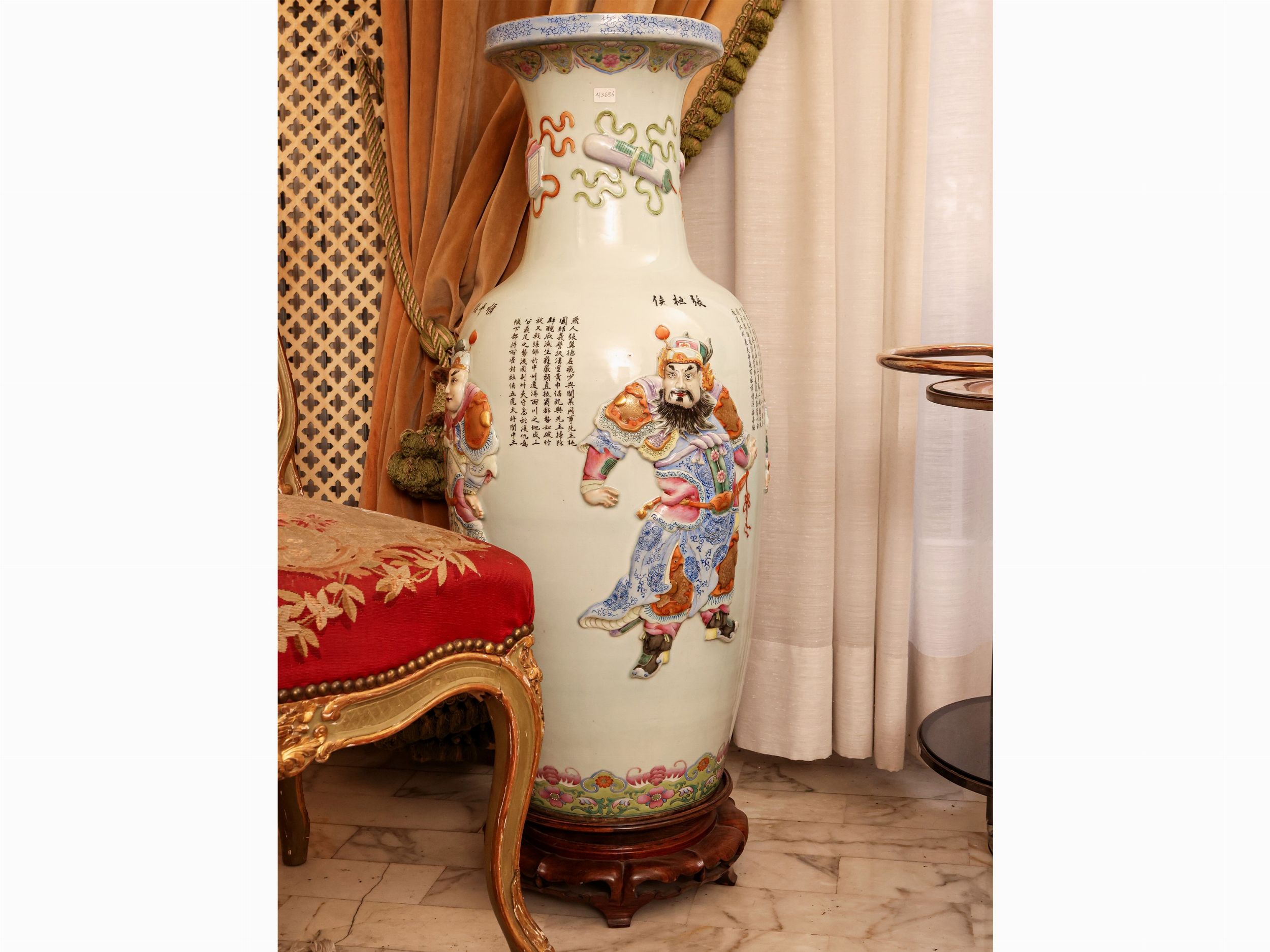 Cina, prima metà del XX secolo dipinto in policromia con quattro figure a bassorilievo di guerrieri e dignitari alternate ad ideogrammi, su base in tek, lievi difetti