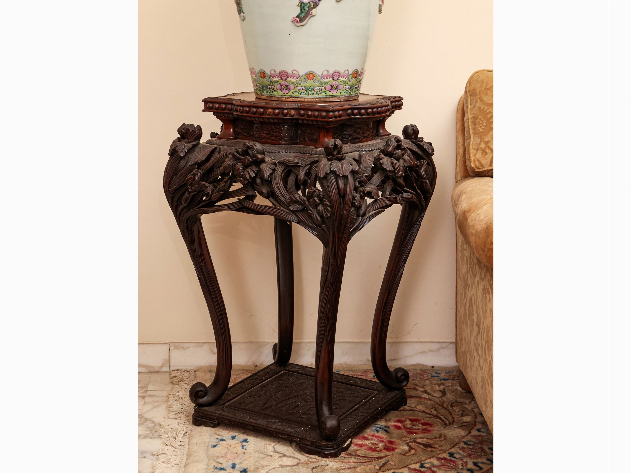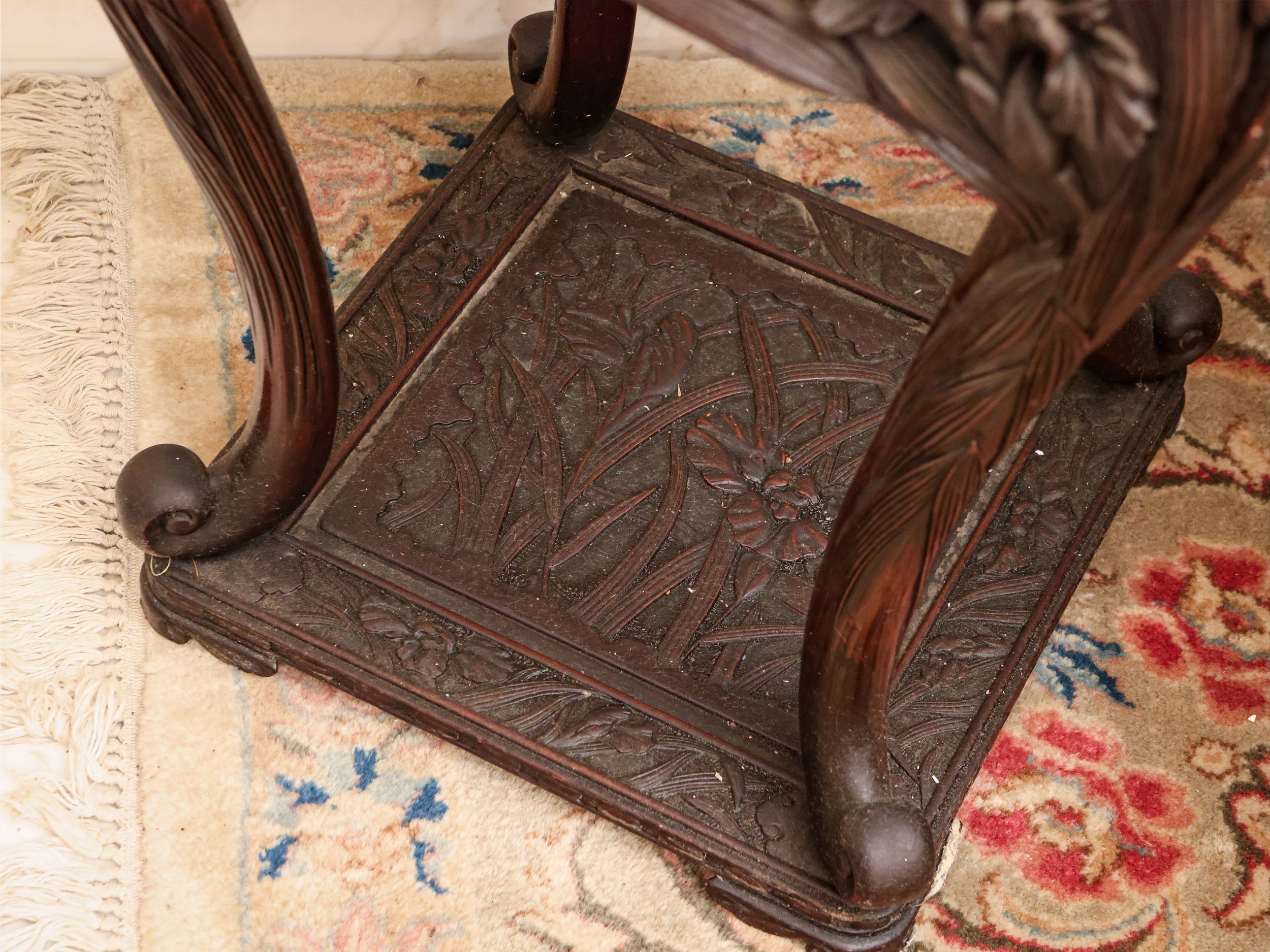 Cina, inizio del XX secolo riccamente intagliato con motivi di iris a tutto tondo, gambe mosse riunite da base decorata con lo stesso motivo
