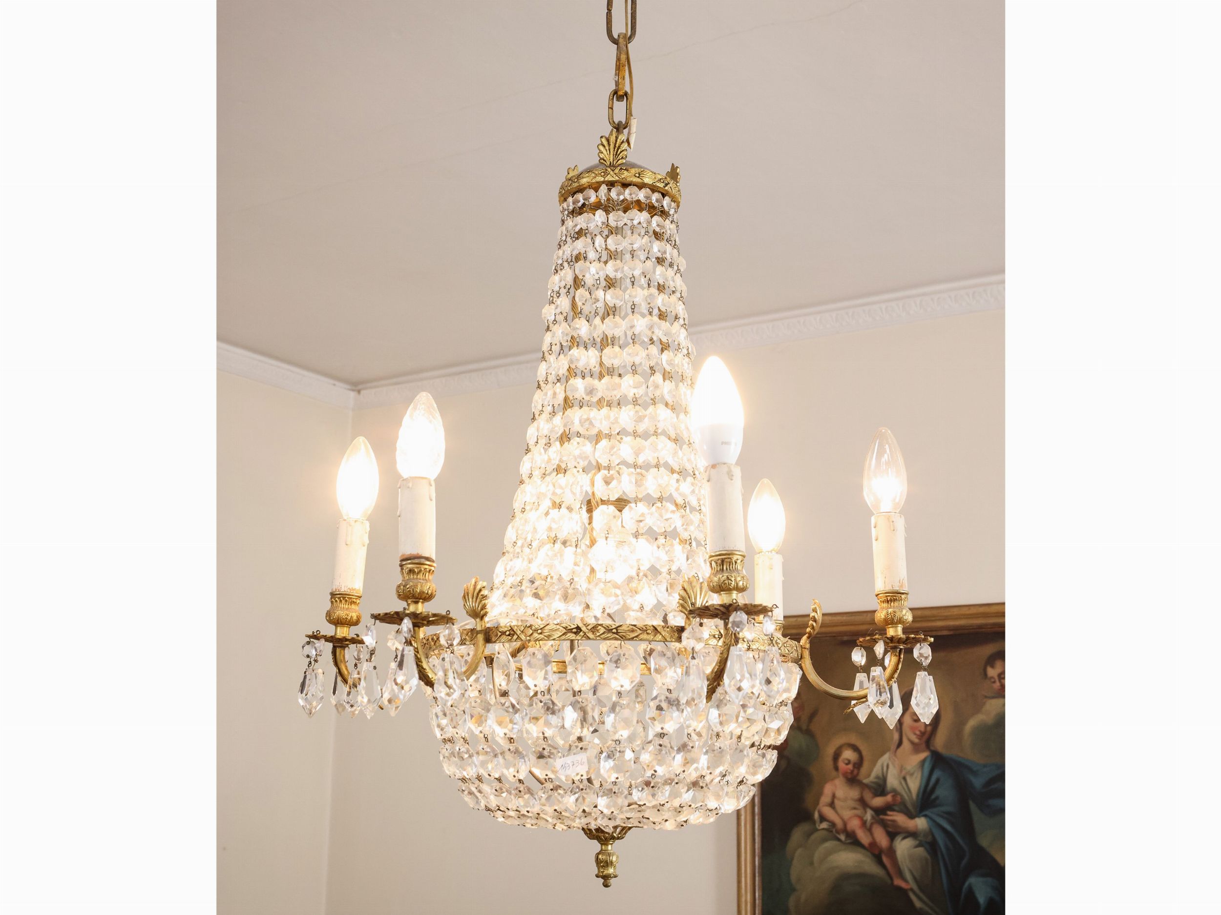 Lampadario a paniere in metallo dorato e cristallo