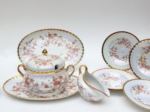 decorati in monocromia magenta a motivi floreali e paesaggi bucolici, orli percorsi da motivi baccellati, composto [..]