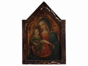 cm 86x56 XX secolo tempera su tavoletta cuspidata, nel gusto della pittura gotica, difetti