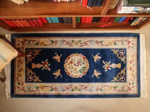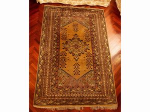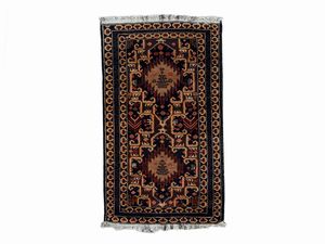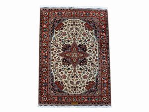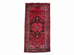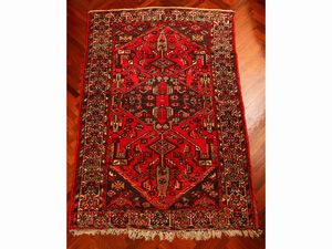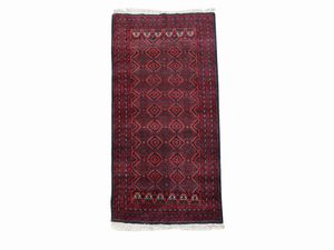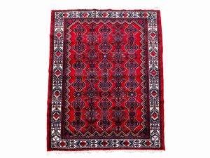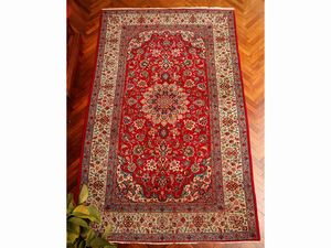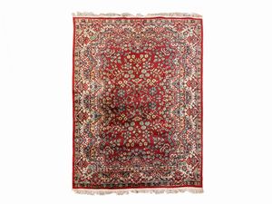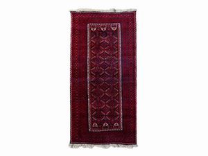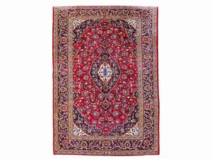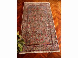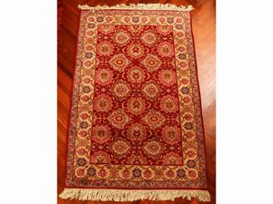 cm 395x254 fondo rosso a motivi floreali, medaglione centrale, bordura blu, celeste e beige