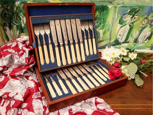 cofanetto cm 6x34x27 Inghilterra, fine XIX secolo composto da 12 forchette e 12 coltelli, manici in osso, lame [..]
